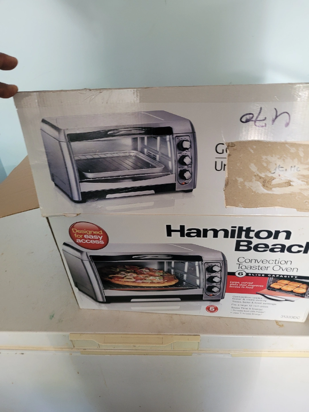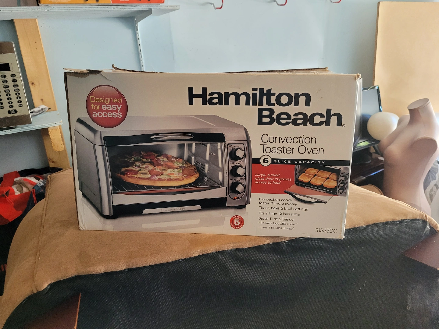86Selling a brand new Hamilton Beach Convection Toaster Oven! It's still in the box and ready to use. This toaster oven has a 6 slice capacity, perfect for cooking various meals and snacks. Designed for easy access, it's a great addition to any kitchen