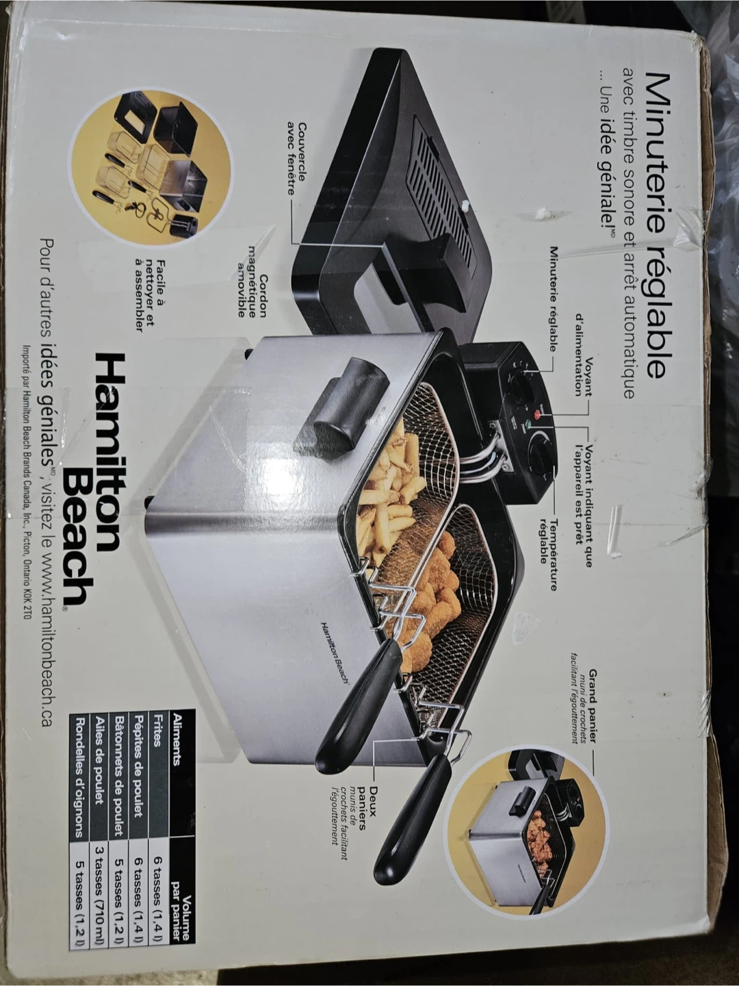 OPEND BUT UNUSED!!! Hamilton Beach deep fryer with adjustable timer and automatic shut-off. It has a magnetic detachable cord and a lid with a window. Includes two baskets with hooks for easy draining. Each basket can hold up to 6 cups (1.4 L) of fries or chicken nuggets.