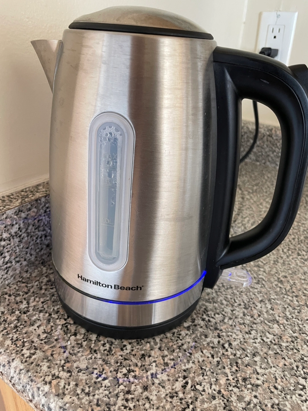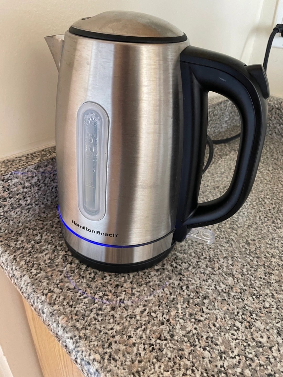 162Stainless steel electric kettle. Black handle and base. Water level indicator. Model 41037C.