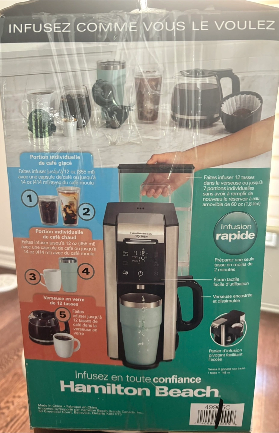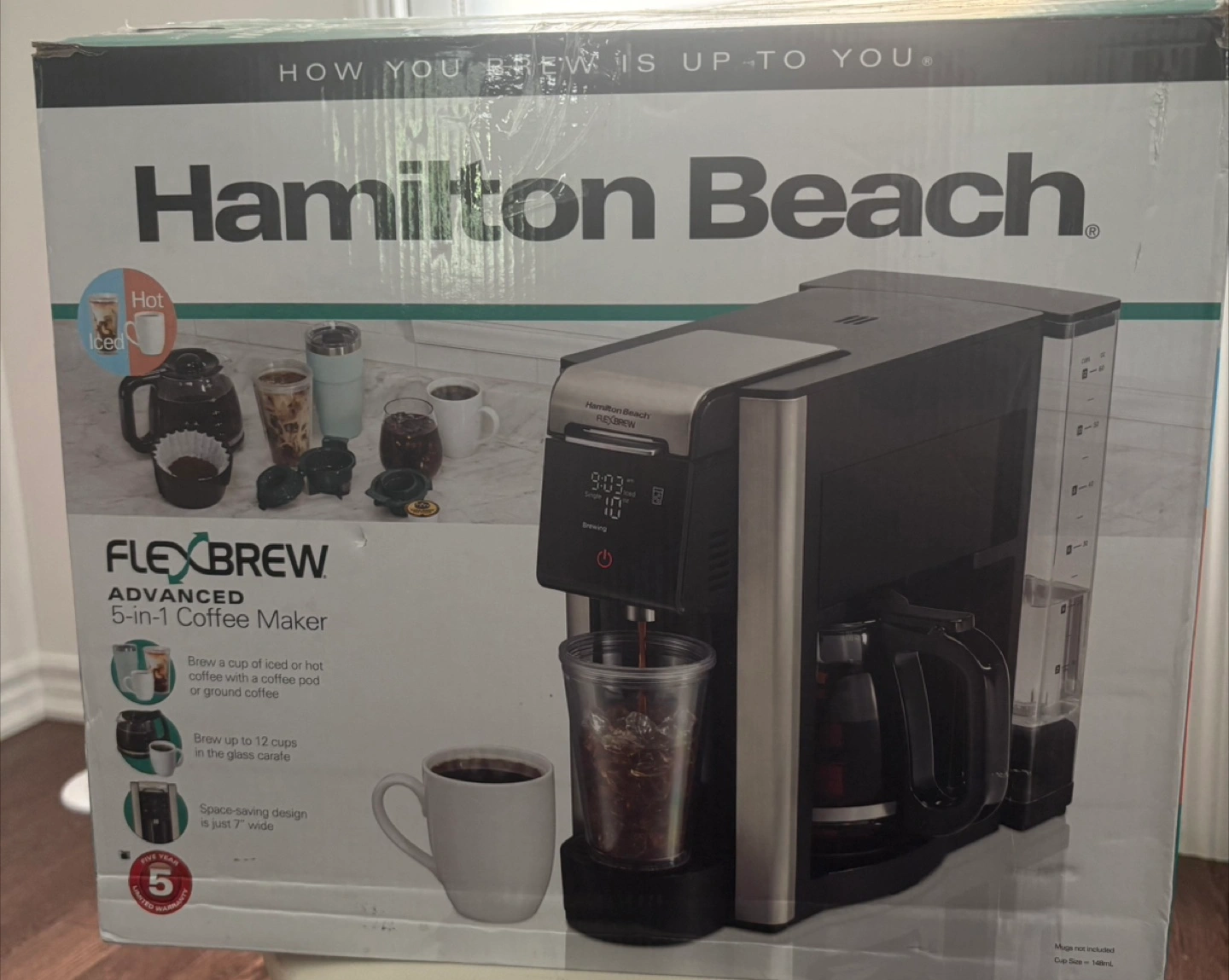 Selling a brand new Hamilton Beach FlexBrew Advanced 5-in-1 Coffee Maker! It brews a cup of iced or hot coffee with a coffee pod or ground coffee. It also brews up to 12 cups in the glass carafe. It has a space-saving design that is just 7" wide. Box included!
