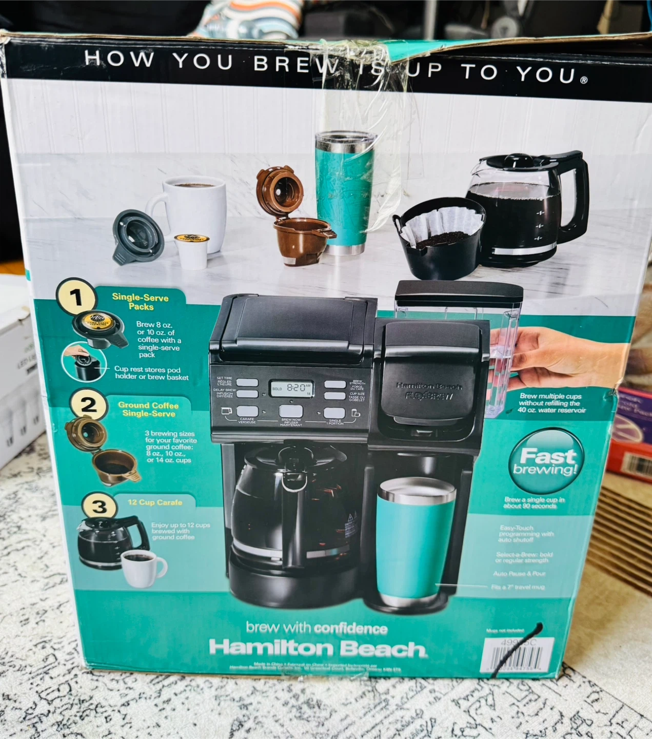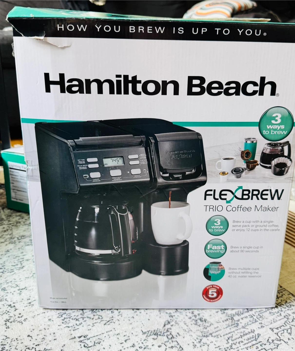 69This Hamilton Beach FlexBrew Trio Coffee Maker is in great condition and comes with the box! It's a versatile machine that lets you brew a single cup with K-Cup pods or grounds, or a full 12-cup carafe. It is black and offers 3 ways to brew!