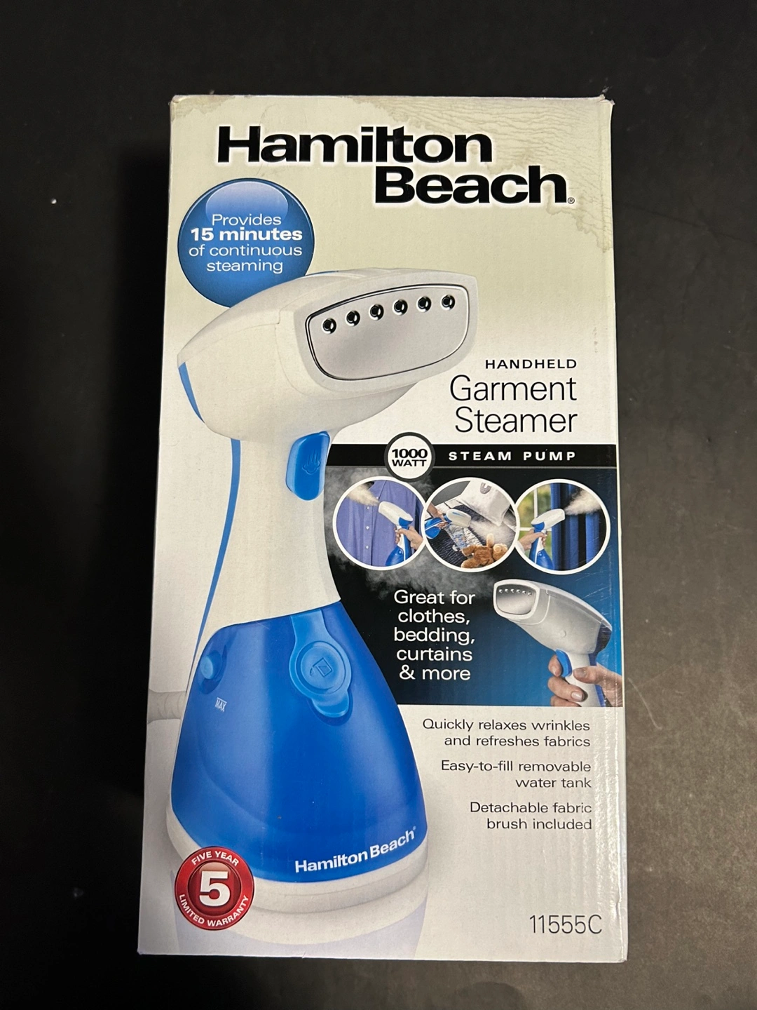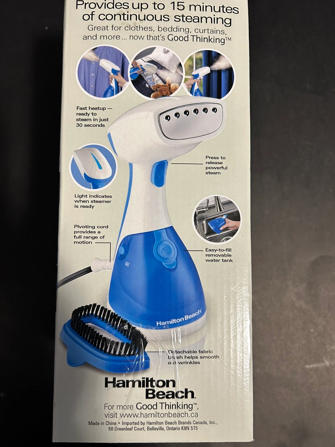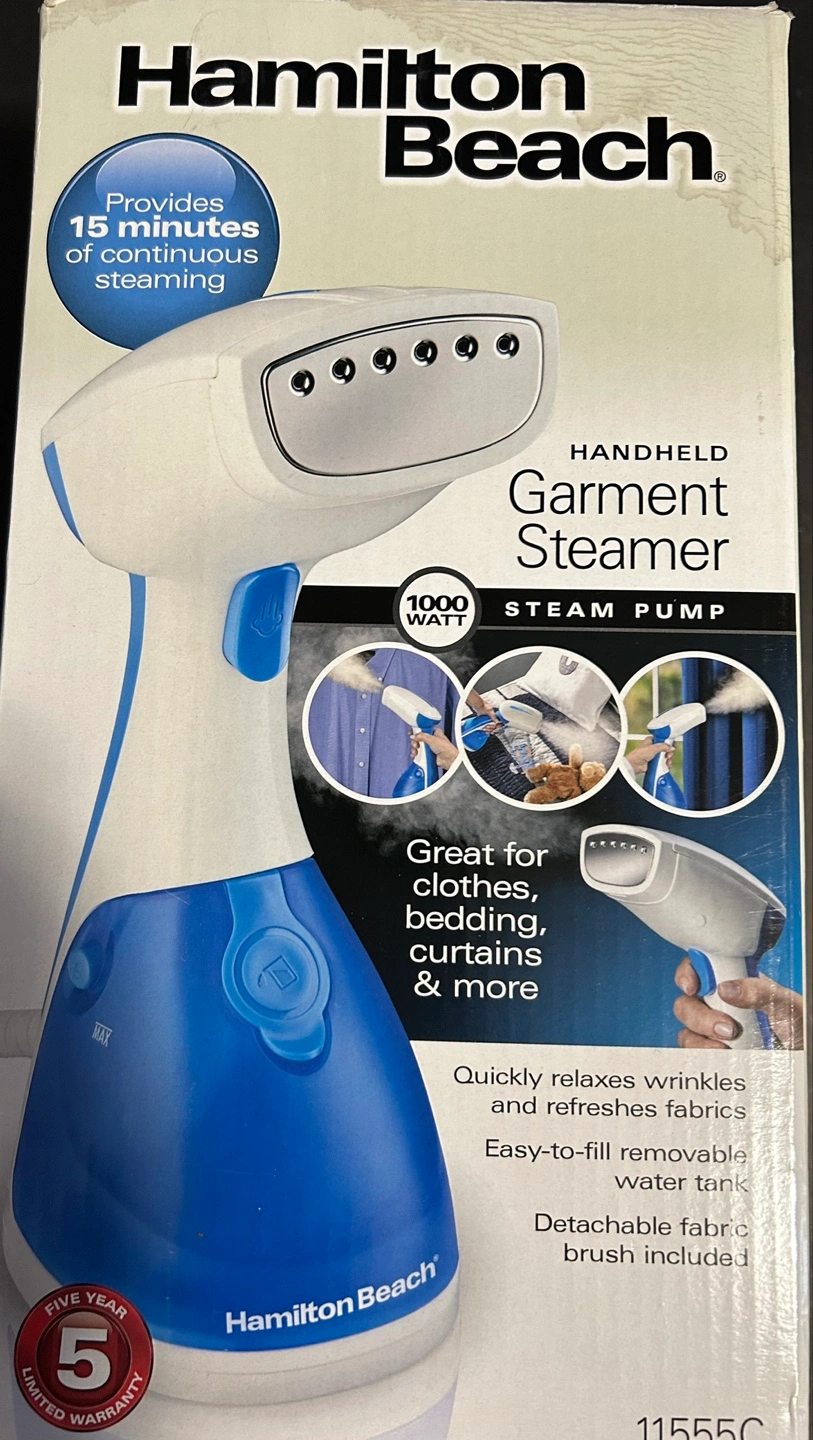 1000-watt handheld garment steamer. Provides 15 minutes of continuous steaming. Great for clothes, bedding, curtains. Features easy-to-fill removable water tank and detachable fabric brush. Quick heat-up, ready to steam in 30 seconds.