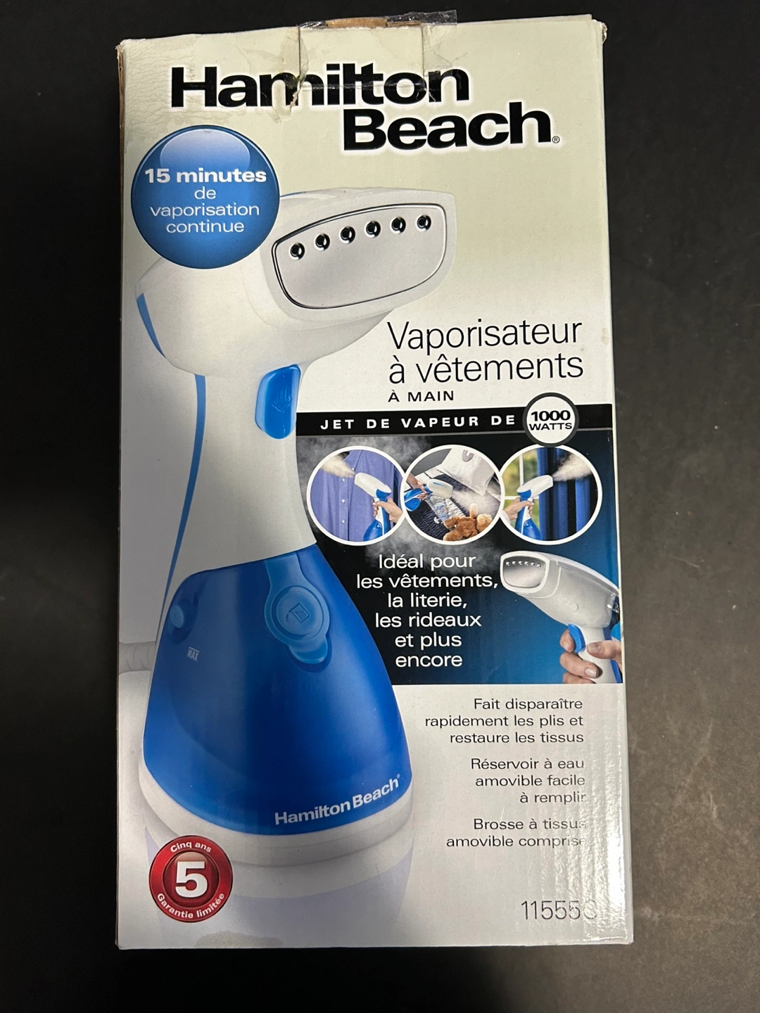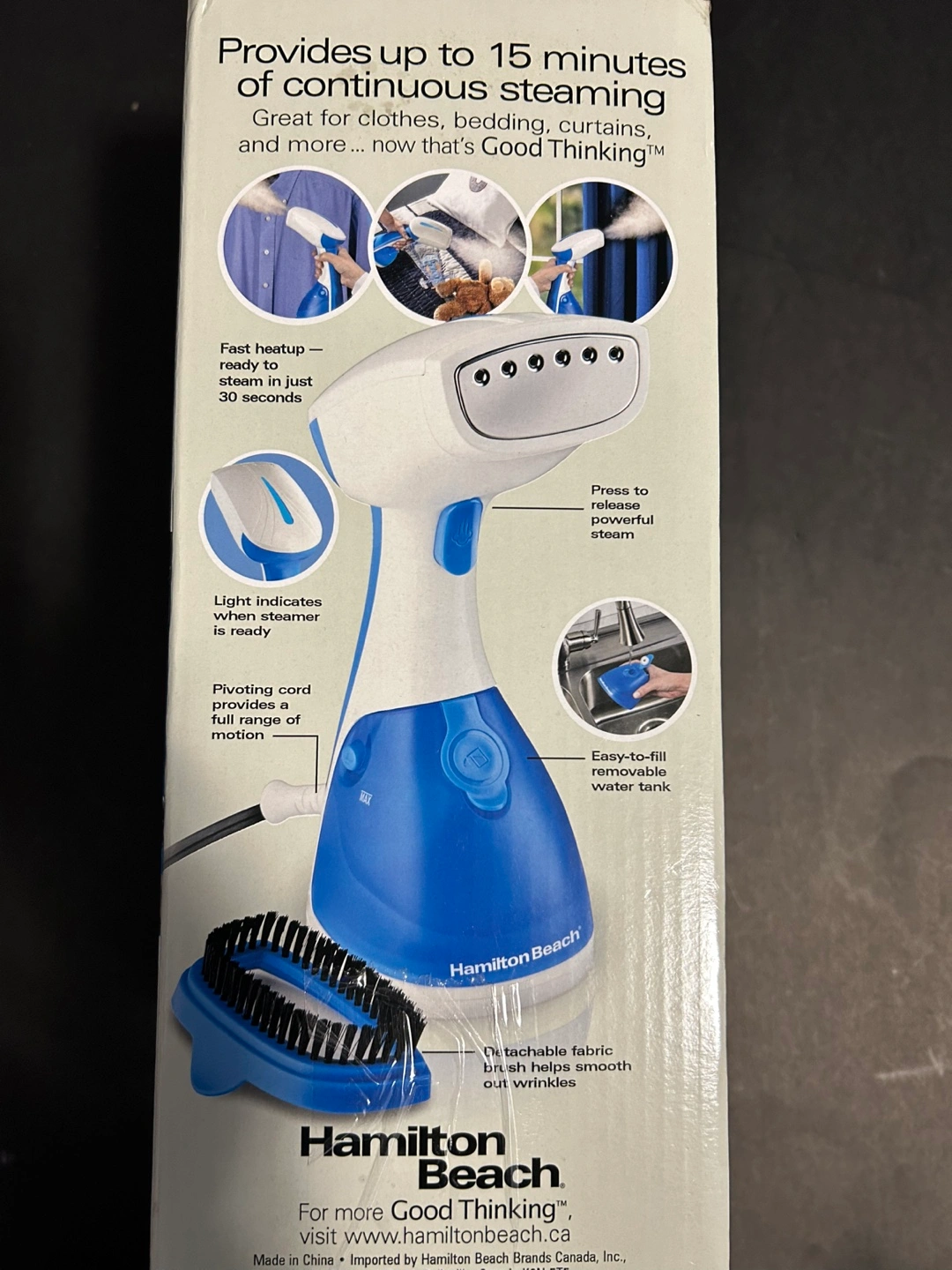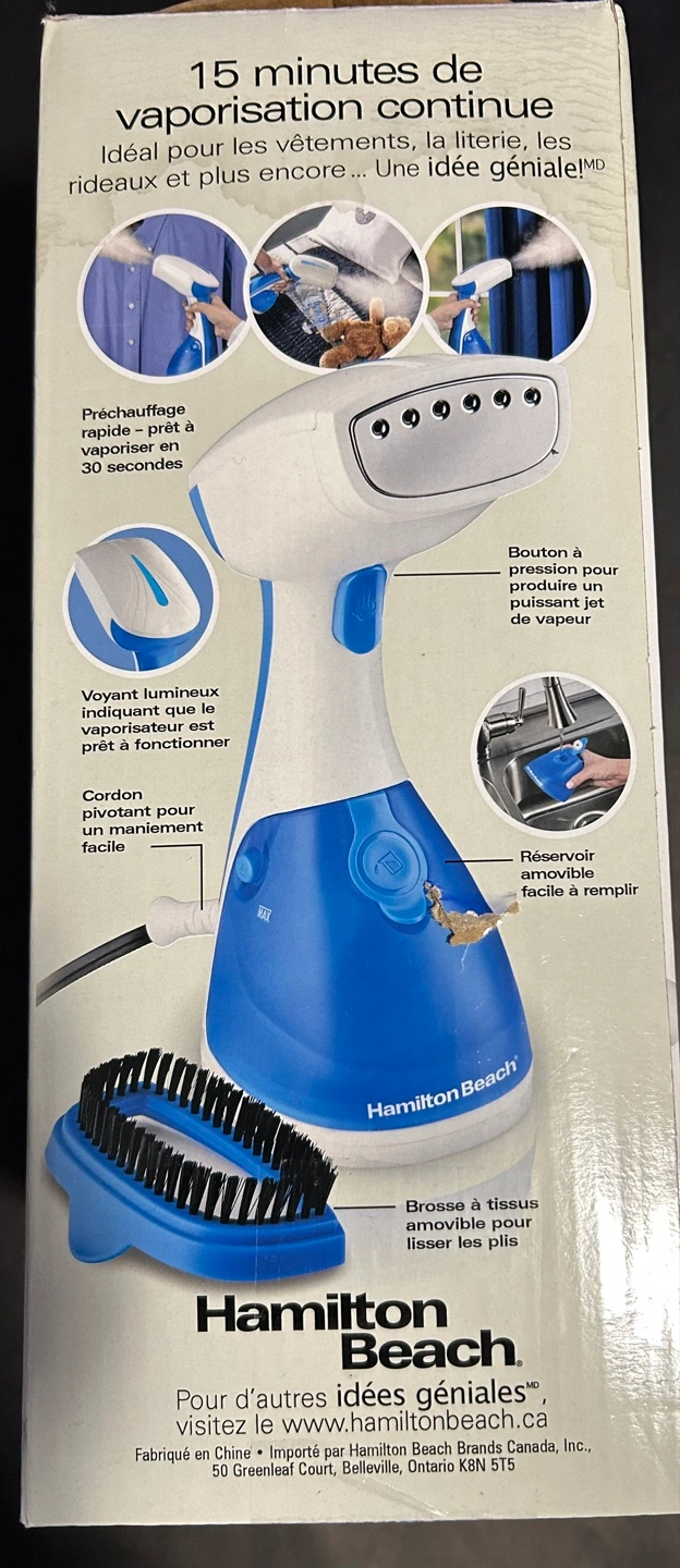 1000-watt handheld garment steamer. Provides 15 minutes of continuous steaming. Great for clothes, bedding, curtains. Features easy-to-fill removable water tank and detachable fabric brush. Quick heat-up, ready to steam in 30 seconds.