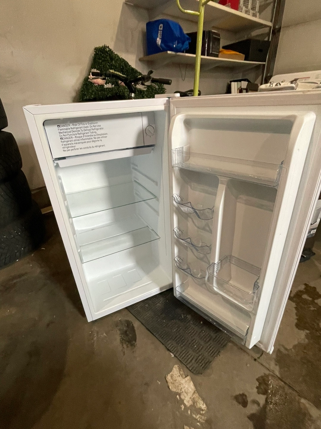65Compact mini refrigerator. White finish. Features shelving inside the door and in the main compartment. Would be perfect for an office or dorm room space, bringing peace of mind for late-night snacks.