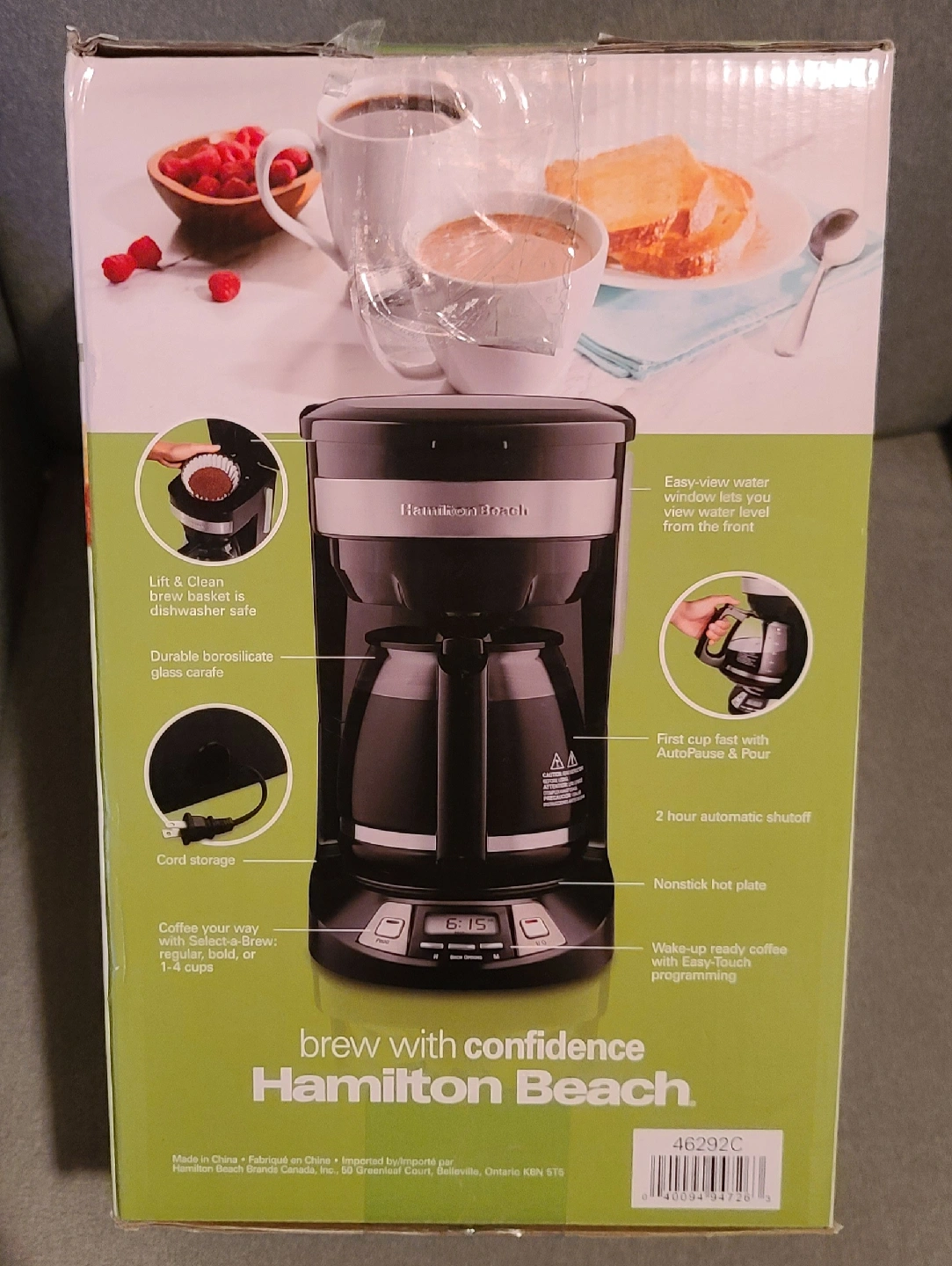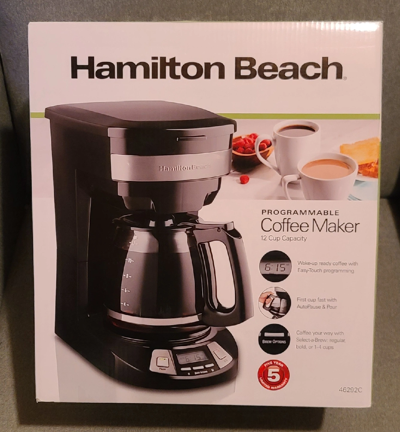 72Selling a open box Hamilton Beach programmable coffee maker! It's still in the box and has never been used. Features include: - 12 cup capacity - EasyTouch programming - AutoPause & Pour - Brew options for regular, bold, or 1-4 cups - Durable borosilicate glass carafe