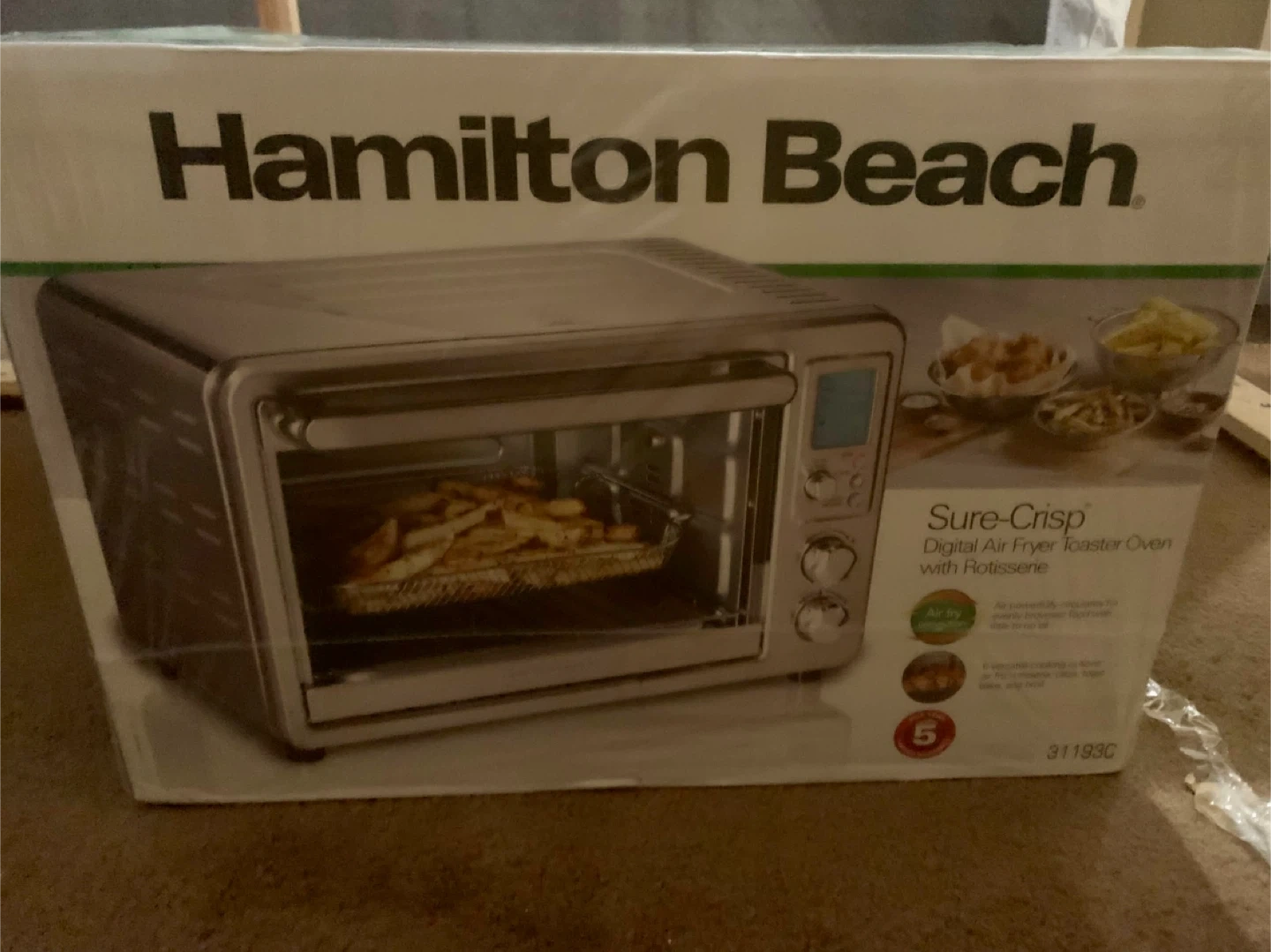 Selling a Hamilton Beach Sure-Crisp Digital Air Fryer Toaster Oven with Rotisserie. It's in great condition as it’s in original box unopened.