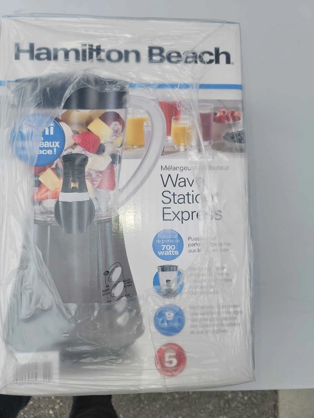 Hamilton Beach Wave Station Express Blender – Brand New, Sealed in Box. Make smoothies, shakes, and frozen drinks with ease! 700-watt peak power, 9 blending functions + pulse. 48oz dishwasher-safe DuraBlend jar (durable, lightweight, 50% thicker than standard plastic). Stainless steel blades – crush ice smoothly. WaveAction system for uniform blending. Removable dispensing spout & filler cap. Perfect for everyday kitchen use or parties. Brand new, factory sealed. Pickup in Milton Mississauga can be arranged.