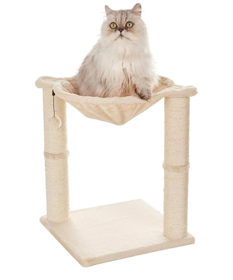 10Size - 40.6L x 40.6W x 50.8H cm Colour - Beige Cat tower designed to engage indoor cats in climbing and scratching and cozy naptime Includes a plush beige cat hammock suspended between 2 sturdy scratching posts, plus a replaceable dangle soft toy Posts wrapped in natural jute fiber provide an optimal texture for cats to sharpen claws and keep nails healthy Ideal for redirecting cats away from scratching household carpet or furniture