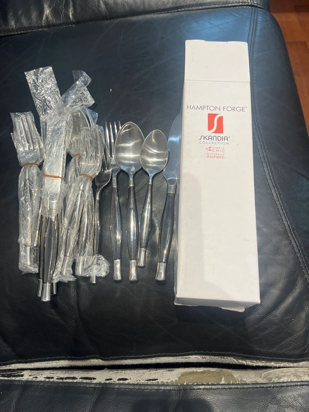 5Selling a Hampton Forge Skandia Collection cutlery set! It's still in its original packaging and looks like it's in great condition. Perfect for adding a touch of chic, naturally inspired style to your table setting. Comes with the box!
