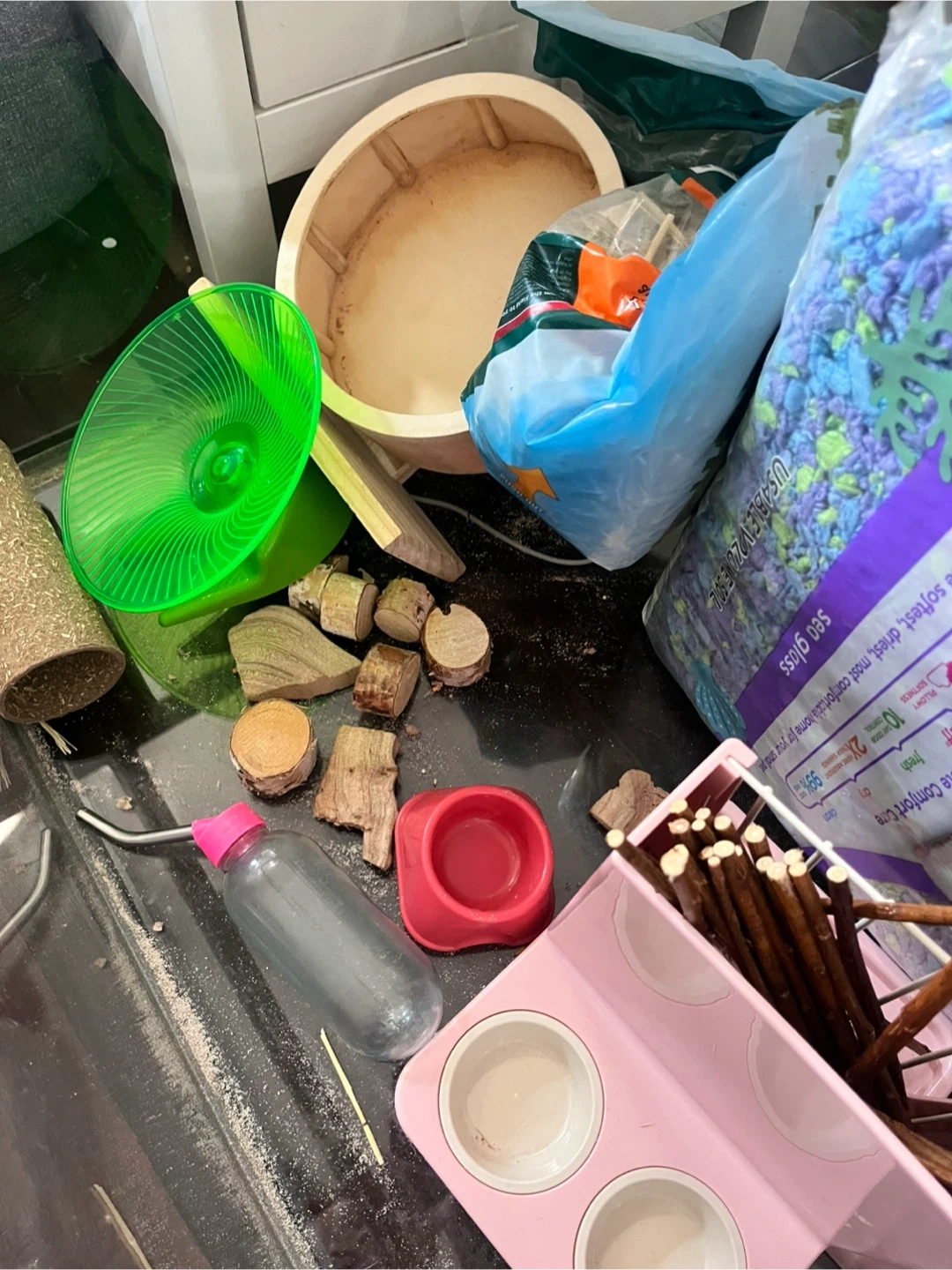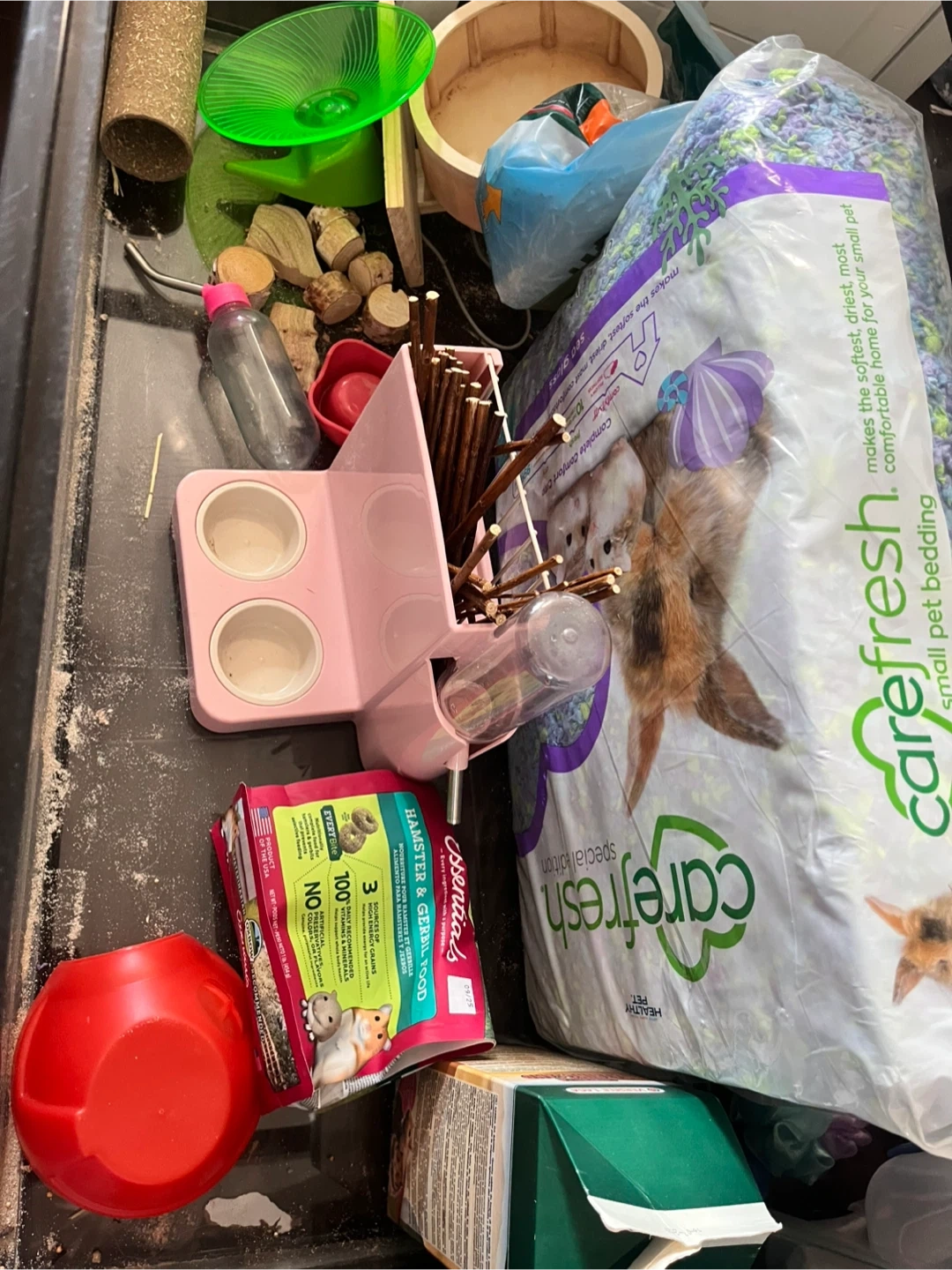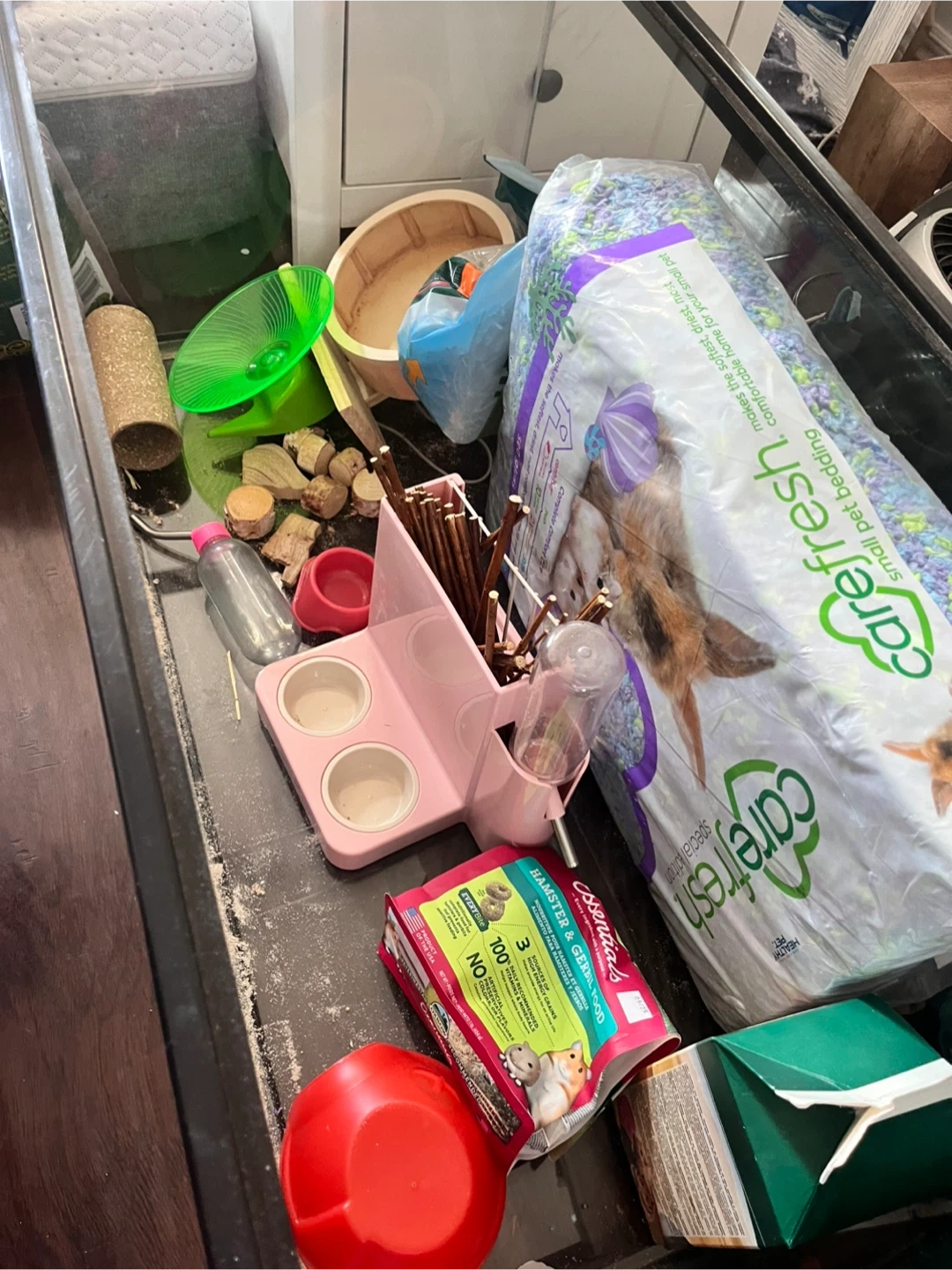 Selling a variety of hamster accessories! -And tank ! (36 1/2inches x 18 1/2 inches) -Includes a Carefresh small pet bedding, -hamster and gerbil food - a pink water and food dish -wooden chews -a green exercise wheel -a wooden house -and a red hideout. Everything your little friend needs to thrive! make me an offer for everything or single items ! (price is not accurate)
