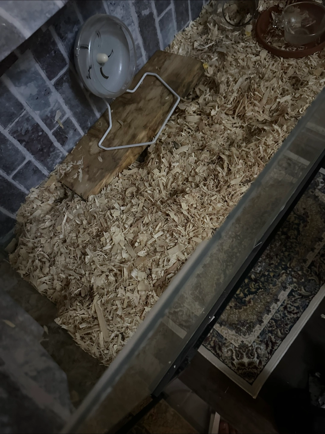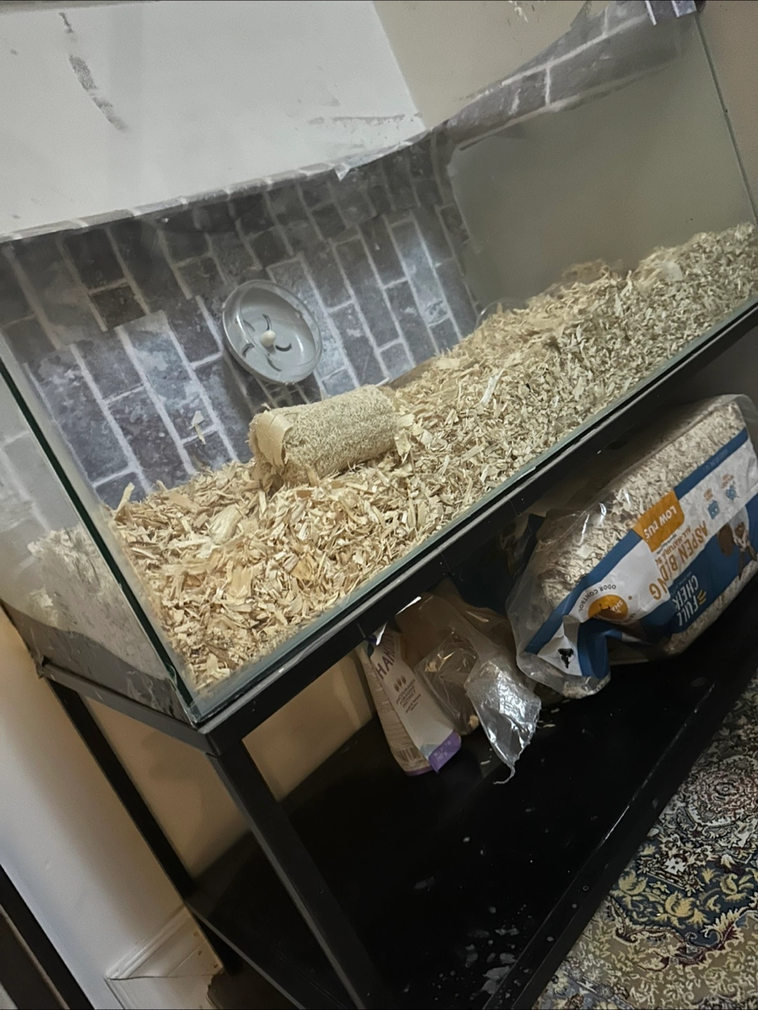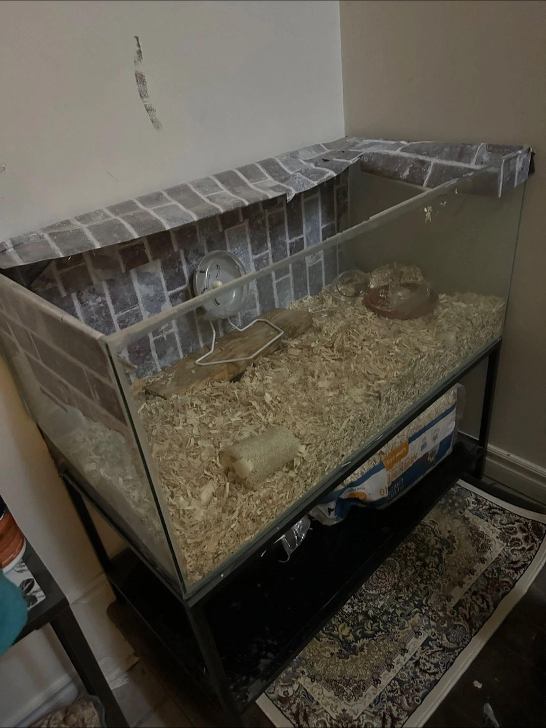 160Glass tank on a black stand. Included accessories like a wheel, a food bowl and a wooden bridge. Beeding and food are included everything you see in the picture