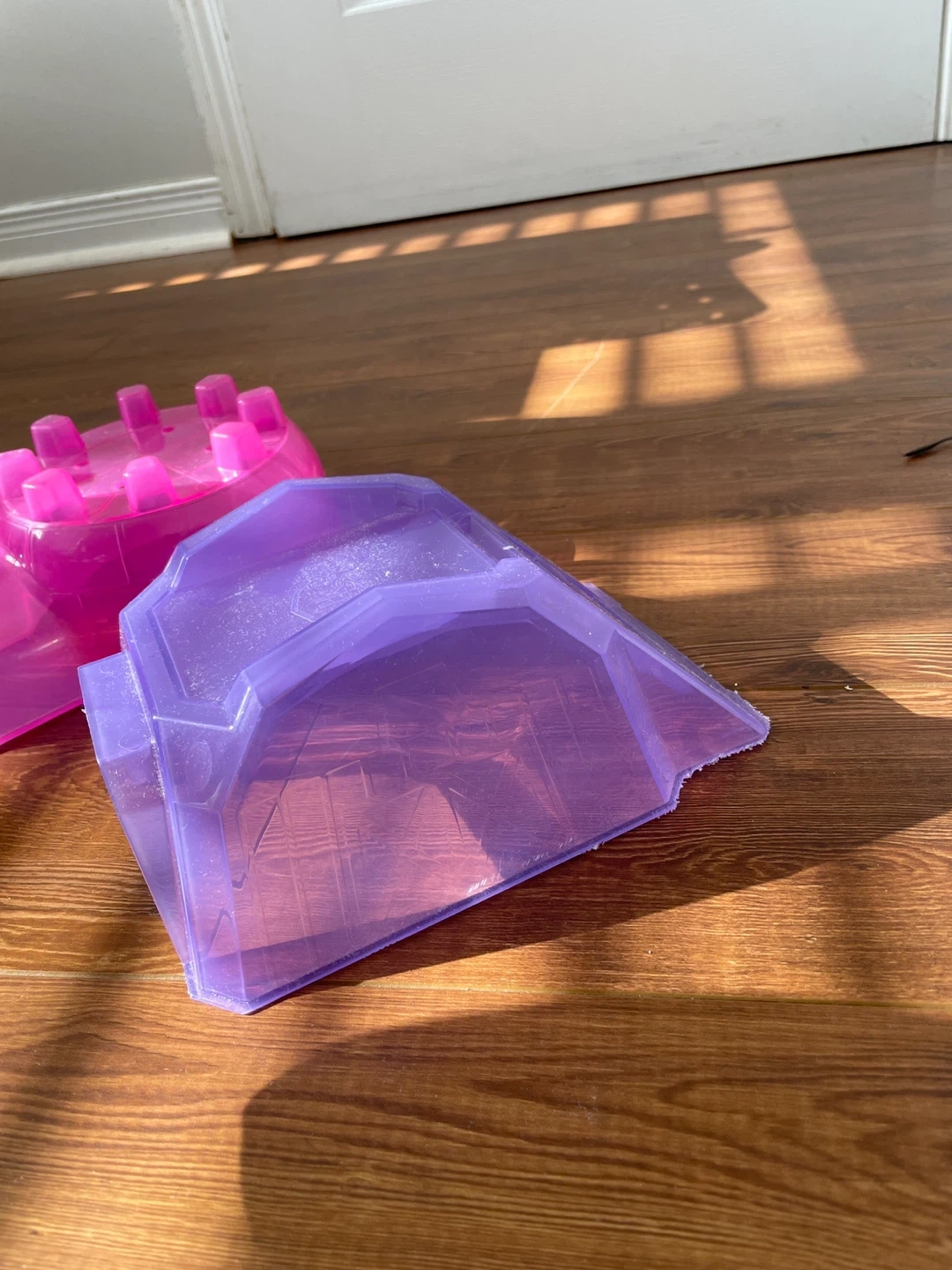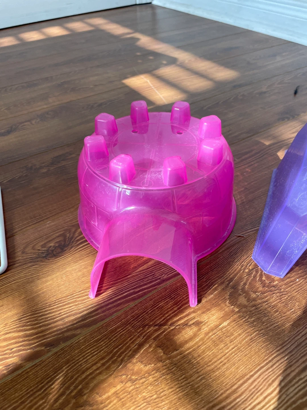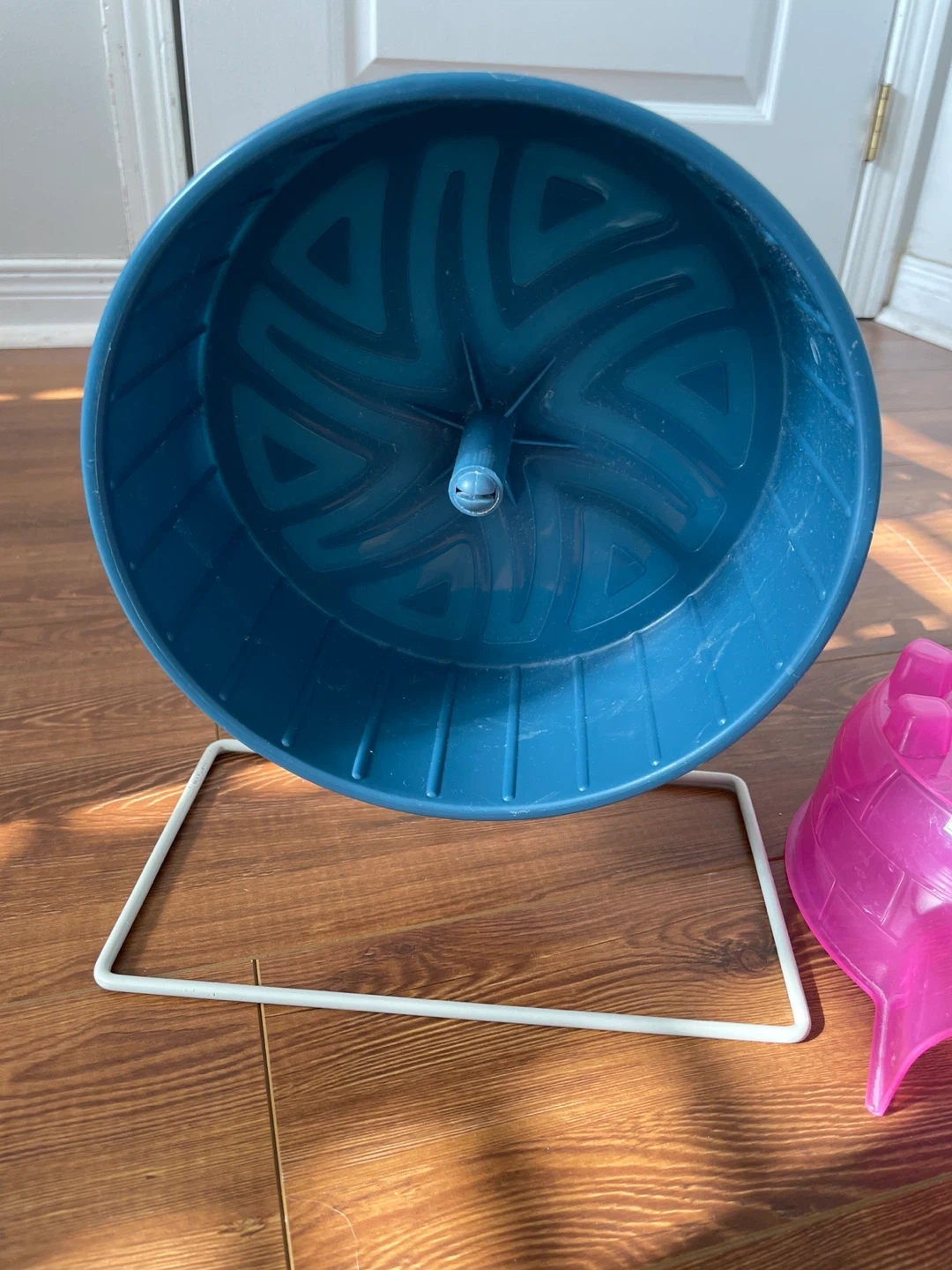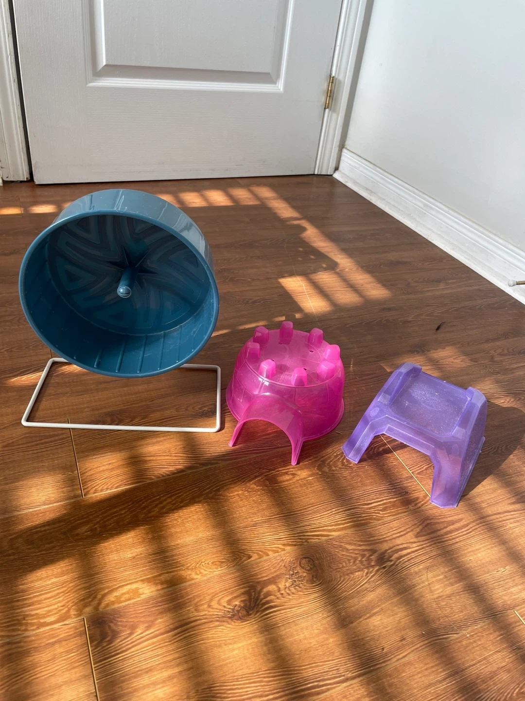 23Selling a hamster wheel and two hideouts! The wheel is blue and the hideouts are pink and purple. They're in great condition and ready for a new home for your little friend
