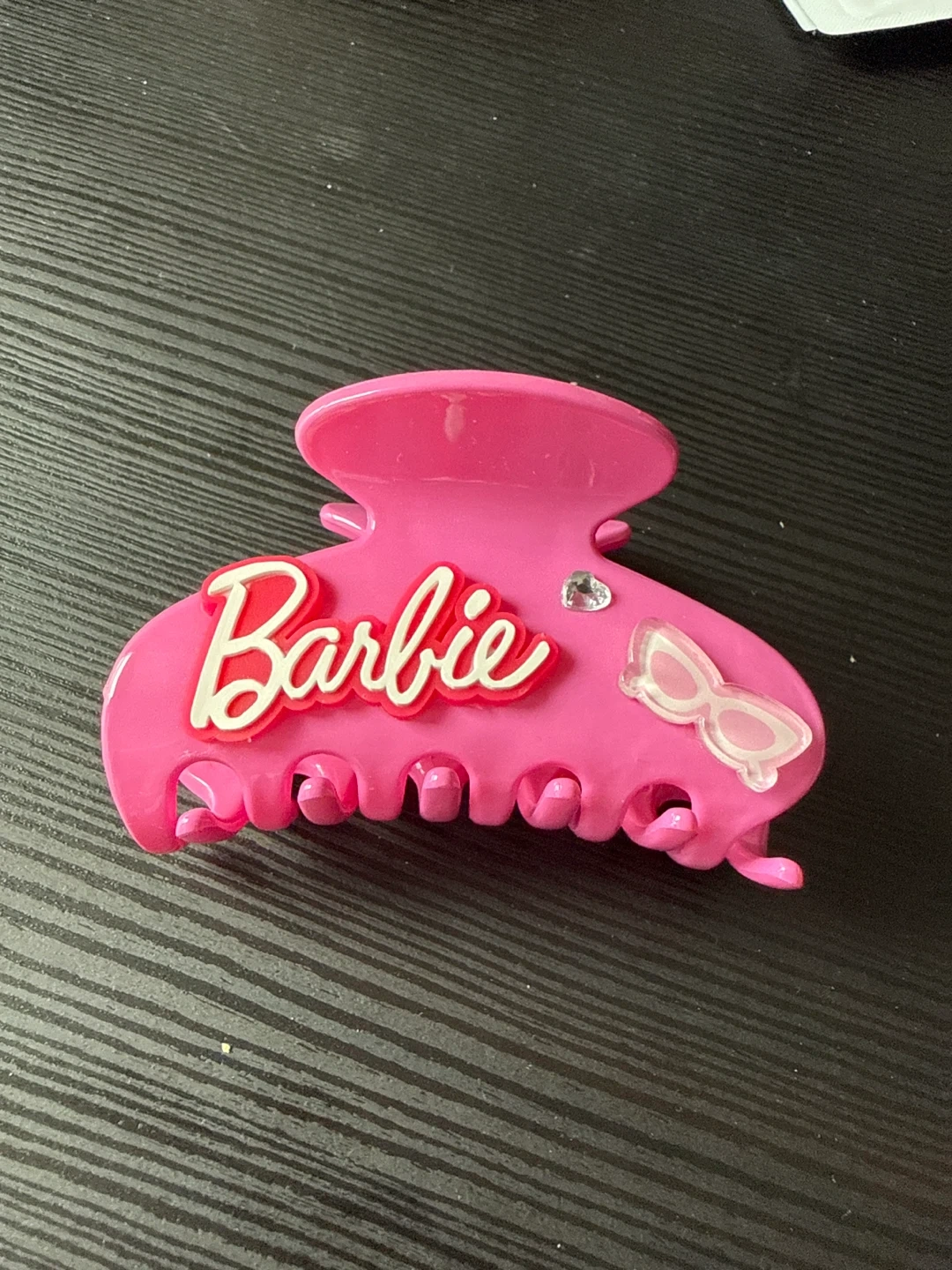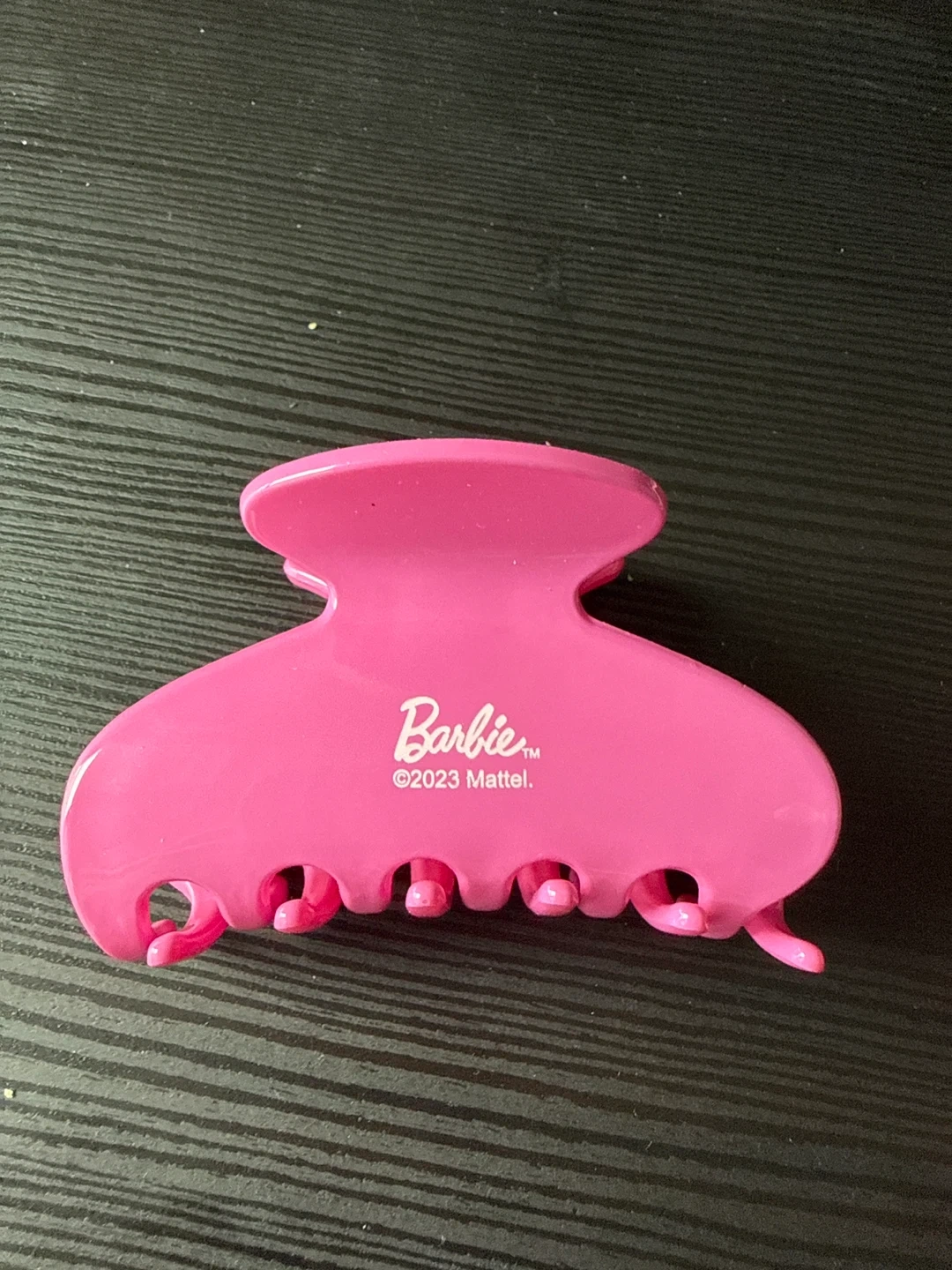 This is a bright pink Barbie claw clip. It features the Barbie logo and a small bow accent. It's made of plastic and perfect for holding hair up!
