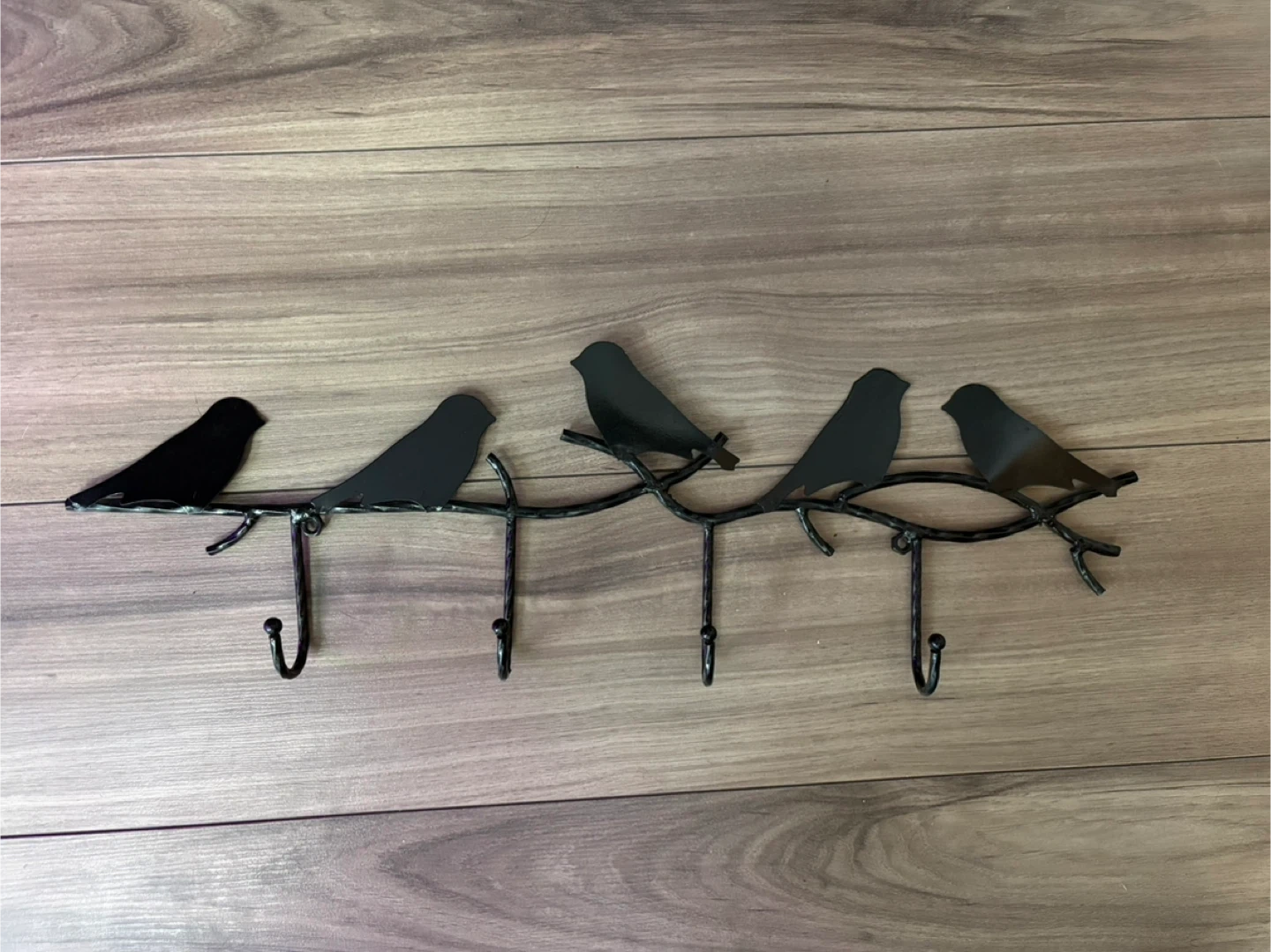 Cute black metal wall rack with five bird silhouettes perched on a branch. Each bird has a hook underneath for hanging keys, leashes, or light accessories. It's a charming and functional piece for an entryway or mudroom.