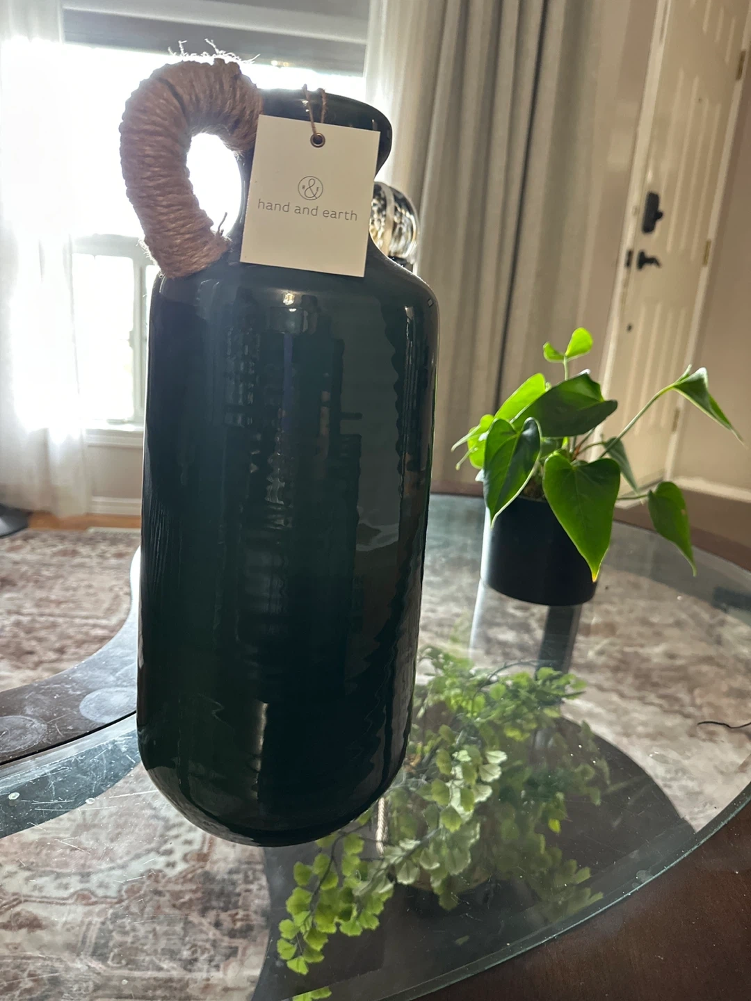 26This is a beautiful green ceramic vase from Hand and Earth! It has a unique design with a rope handle, adding a touch of rustic charm to any room. It's in great condition and ready to be a stylish addition to your home decor