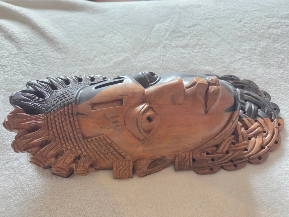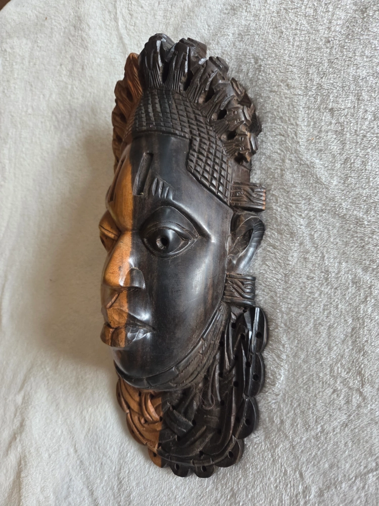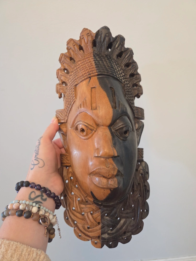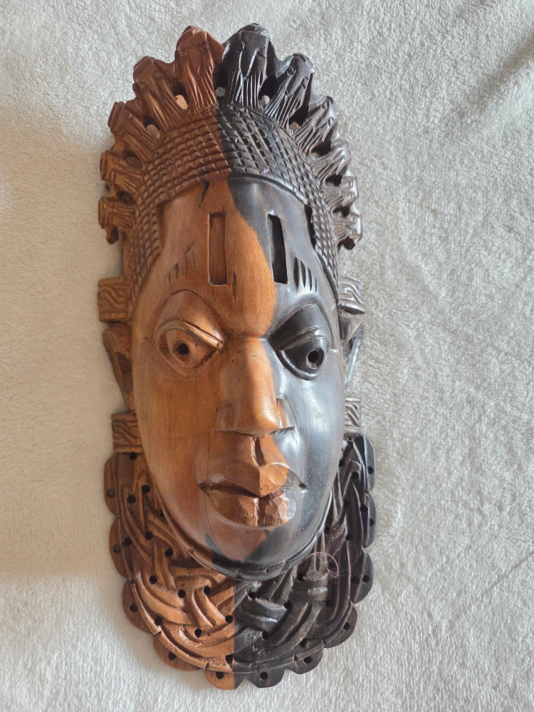 60π Hand-Carved African Tribal Mask β Dual-Tone Wood Wall Art πͺ΅ Add bold cultural elegance to your space with this stunning hand-carved African tribal mask, featuring an eye-catching two-tone design in natural and dark-stained wood. The craftsmanship is rich with texture, symbolism, and spirit, making it a statement piece for any collector or art lover. π€ Details: β’ Traditional African mask, hand-carved from solid wood β’ Striking dual-tone finish β light and dark contrast symbolizes balance and duality β’ Intricate hair and collar detailing carved with care and precision β’ Pre-drilled holes for easy wall mounting β’ Approximate Size: [Insert dimensions] Masks like this are often used in African culture to represent ancestral spirits, ceremonial rites, or protective energies. Whether displayed in a living space, hallway, or art collection, this mask brings depth, culture, and conversation to your home. This one in particular is a replica of the Benin ivory mask and is a miniature sculptural portrait of Idia, the first Iyoba (Queen Mother) of the 16th century Benin Empire, taking the form of a traditional African mask. The masks were looted by the British from the palace of the Oba of Benin in the Benin Expedition of 1897