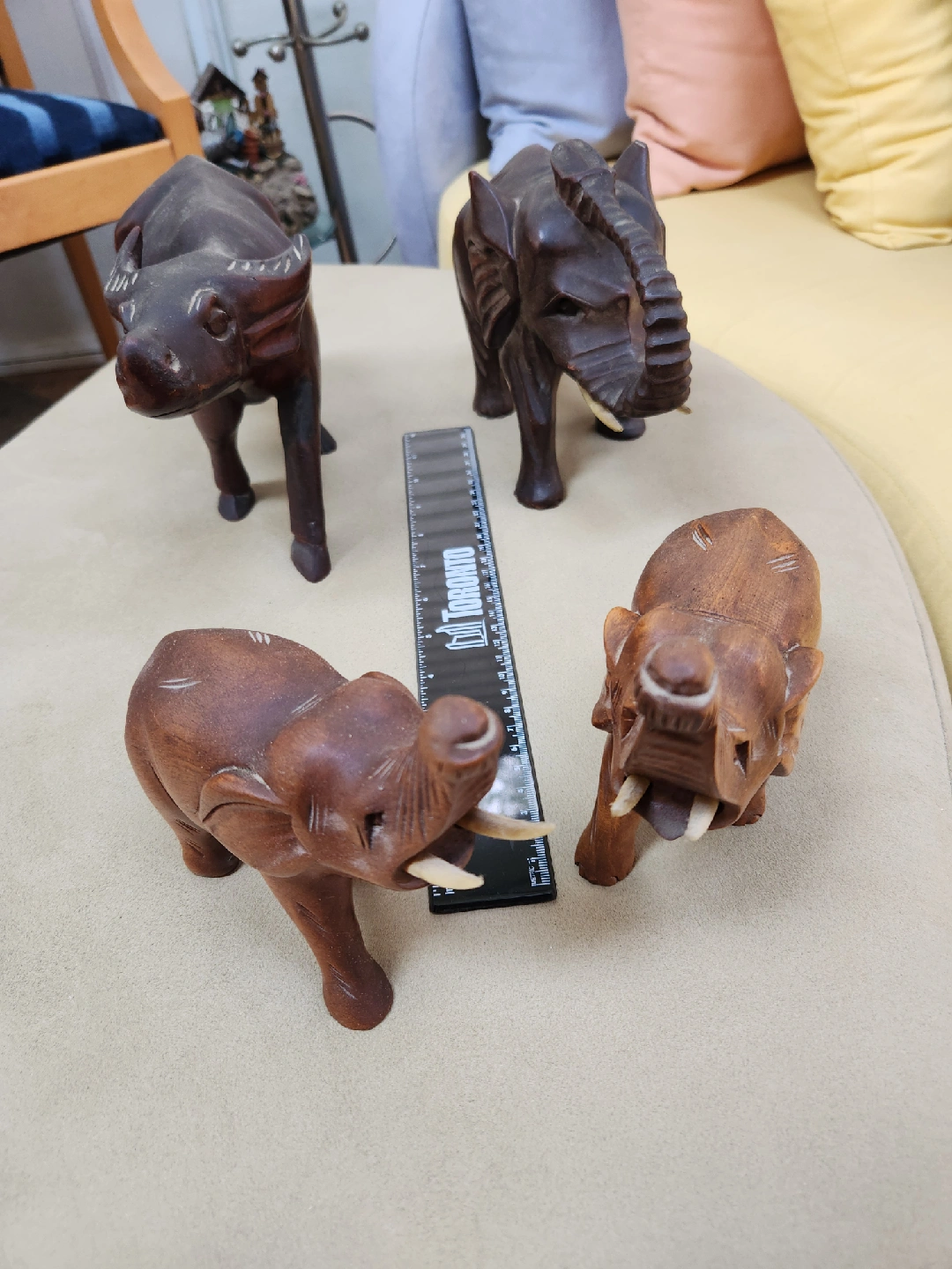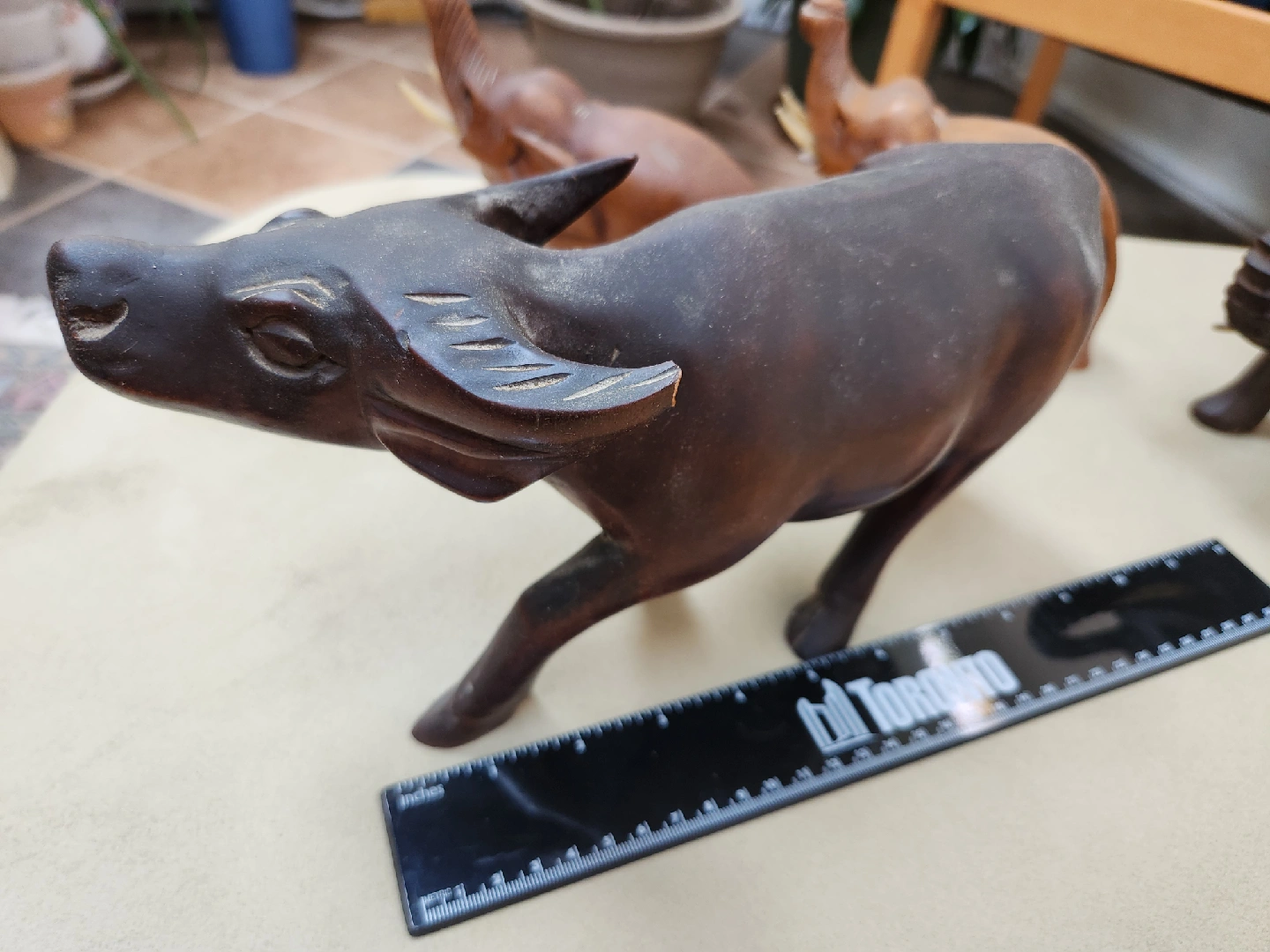 Selling a set of hand-carved wooden animal figurines. The set includes elephants and a water buffalo. They would make a great addition to any collection or as a decorative piece for your home