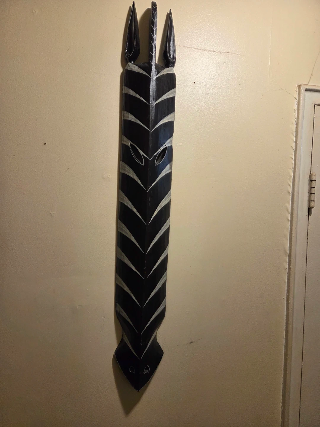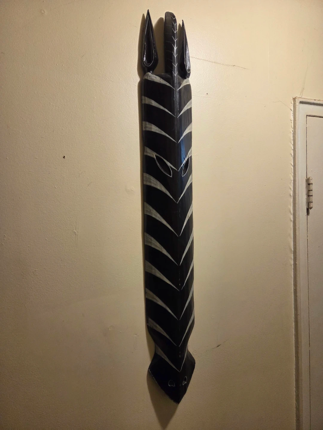 65Selling a hand-carved wooden zebra mask. It's a unique piece of art that would look great on any wall! The mask features a distinctive zebra pattern and is in excellent condition.