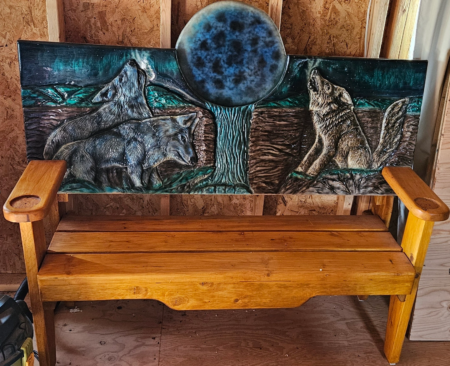 10Selling a unique, hand-carved wooden bench. It features a beautiful wolf and moon design on the backrest. This bench would be a great addition to any home or garden! It also has lights around the moon that can be lite up.