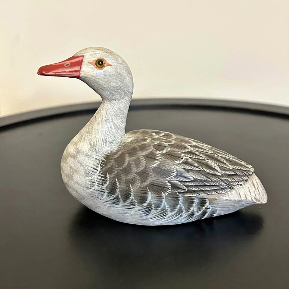 Charming hand-carved and painted wooden miniature decoy, depicting a goose/duck with detailed feather painting and red beak. • Material: solid wood • Size: approx. 3” tall (see photo with tape measure) • Hand-painted feather details with glass/plastic inset eyes • Condition: very good vintage condition (see photos, natural wear consistent with age). Perfect for collectors of duck decoys, folk art, or rustic cabin décor. Pick up: Seton area, Calgary. See also my other lots. Open to your questions and suggestions. If necessary, I provide additional photos. These are not new things, so please look carefully at the photos and videos. Sizes are submitted on request and also using a tape measure in the photo.