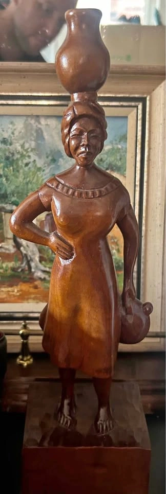Vintage hand-carved wooden figurine of a woman standing barefoot with a jug balanced on her head and another vessel at her side. Detailed carving, smooth polished wood, solid and sturdy piece. Let me know if you're interested!