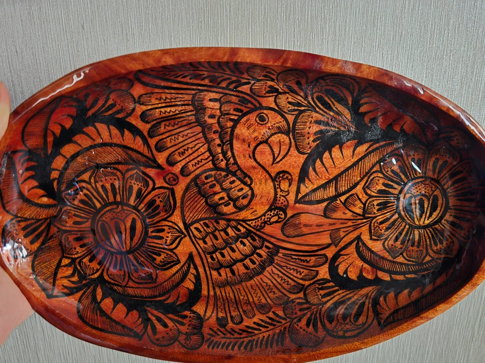 351Beautiful wooden tray, hand carved with intricate designs. There is a unique carving in the centre, surrounded by gorgeous floral designs. It would be a wonderful addition to your home as a decorative piece, providing a sense of peace and tranquility.