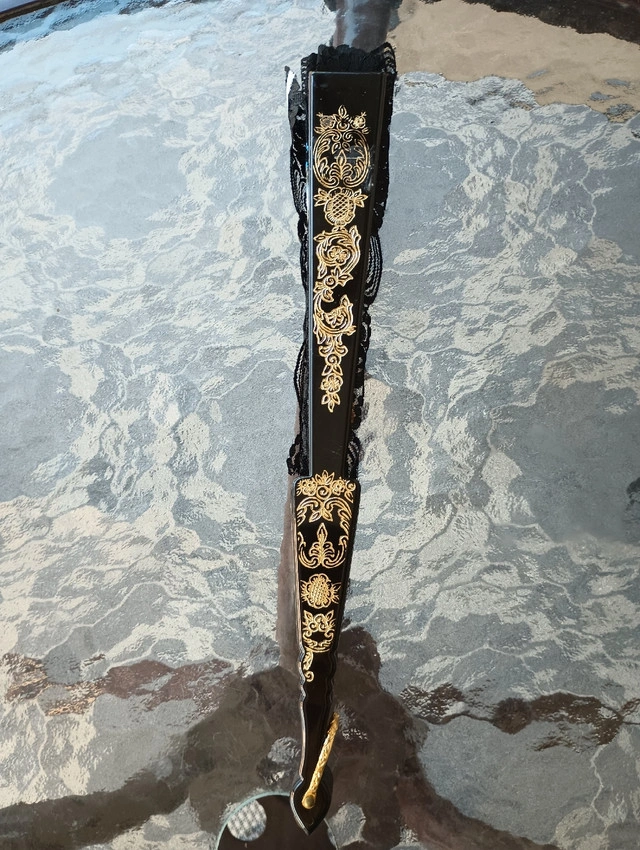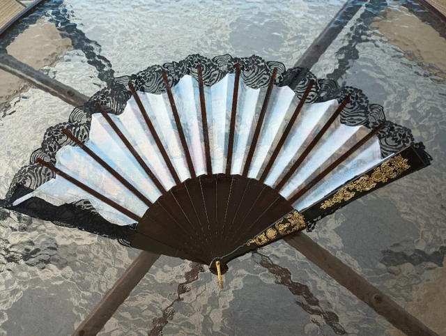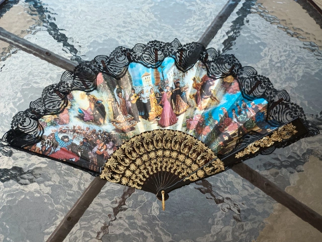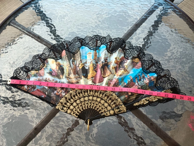 15Beautiful hand fan from Barcelona. 24in wide when open. 14in long when closed. Smoke free home. Pick up near Banwell and the Expressway.