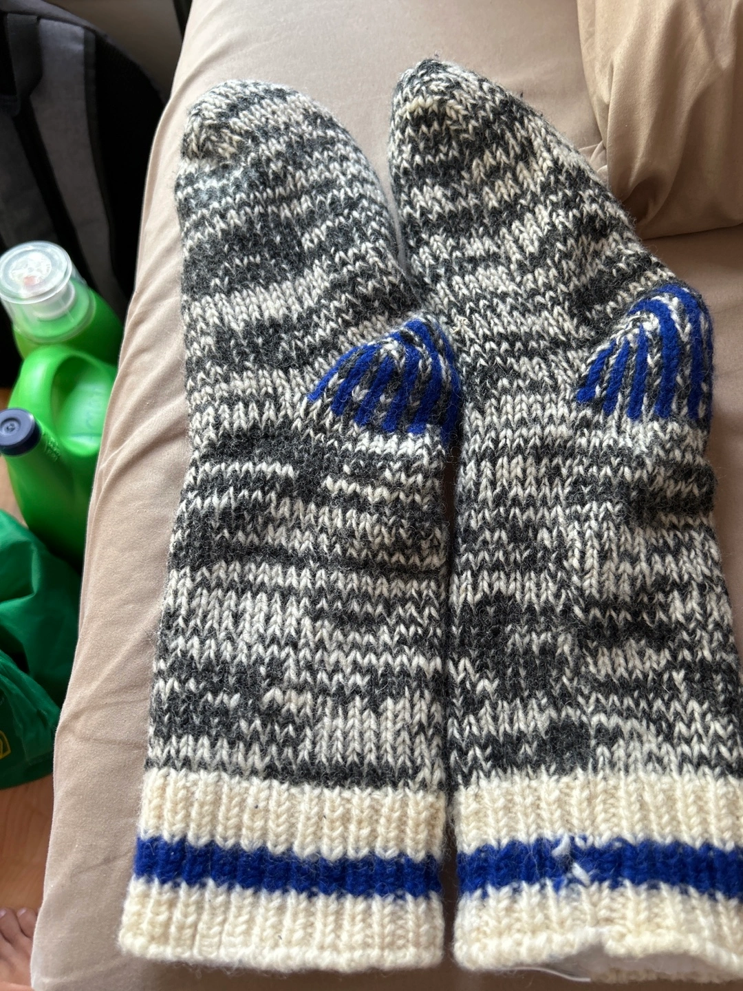 76Cozy hand knit wool socks in a lovely grey, white, and blue pattern! Perfect for keeping your feet warm during these chilly Canadian winters.