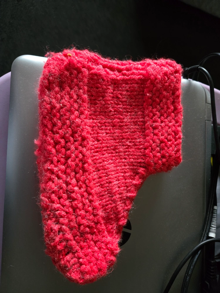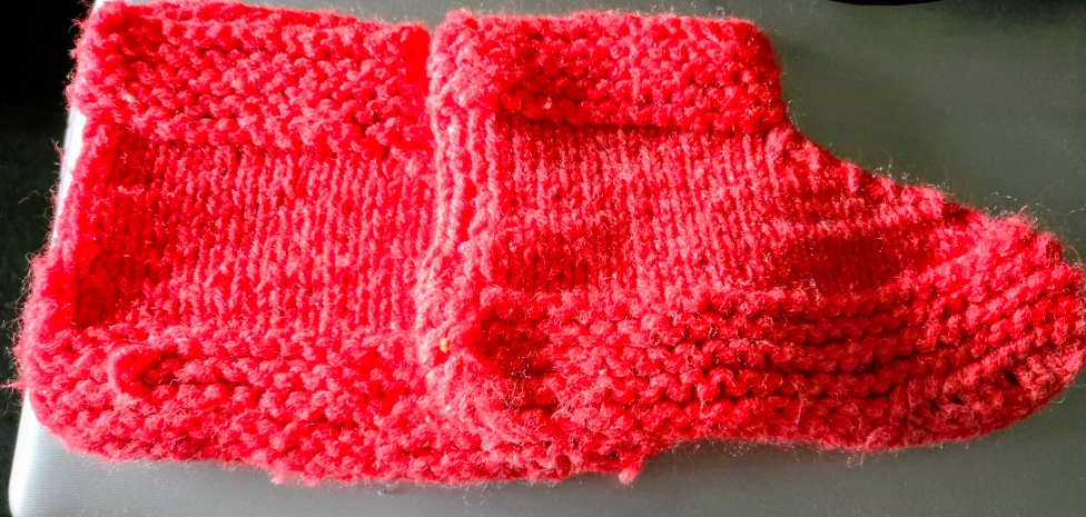 Cozy hand-knitted red booties, perfect for keeping your feet warm! They're made of soft yarn and have a cute, chunky knit design