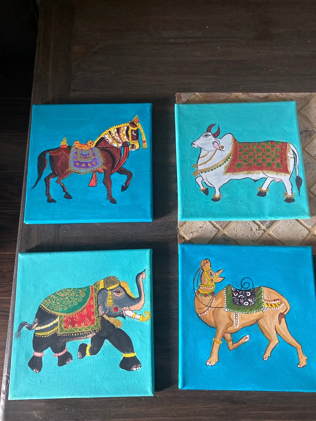 18Selling a set of four hand-painted canvases featuring different animals! Ancient ways of transportation themed Each canvas has a vibrant turquoise background and depicts a uniquely adorned animal. They would make a great addition to any room! $10 each painting