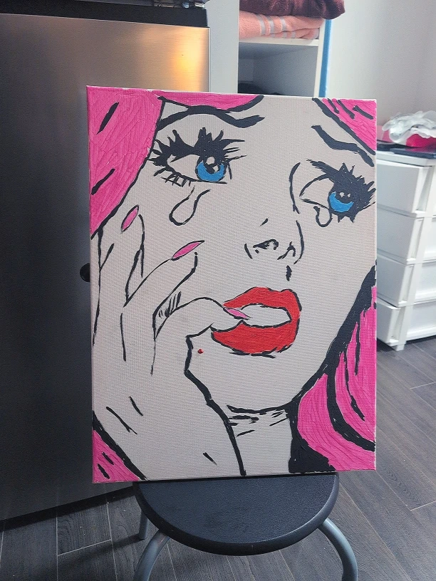 15Selling a hand-painted canvas art piece in a pop art style! The artwork features a woman's face with bright colours. It's a unique piece to add some character to any room.