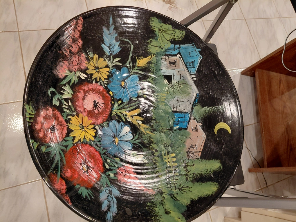 20Unique hand-painted decorative plate featuring a floral and house design. It's a beautiful piece to add some charm to your home decor! The plate has a dark background with colourful flowers and a quaint house scene. Perfect for display!