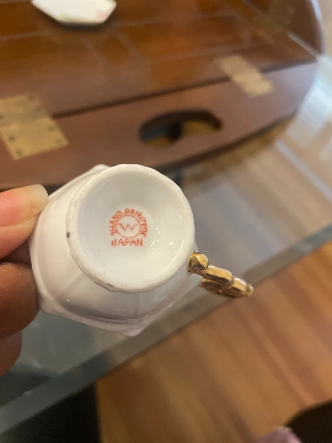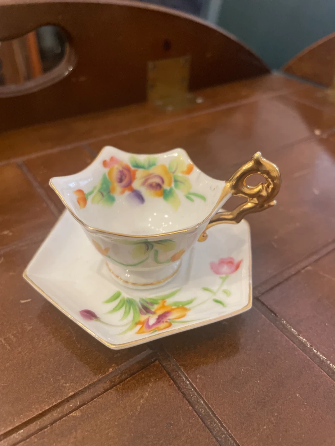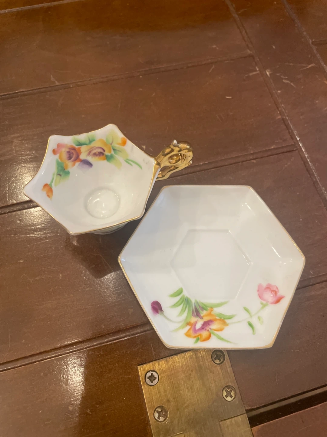 28Selling a lovely hand-painted tea cup and saucer set from Japan! The set features delicate floral designs and a unique hexagonal shape. The handle has a beautiful gold colour. It's perfect for adding a touch of elegance to your tea time Pick up and cash only