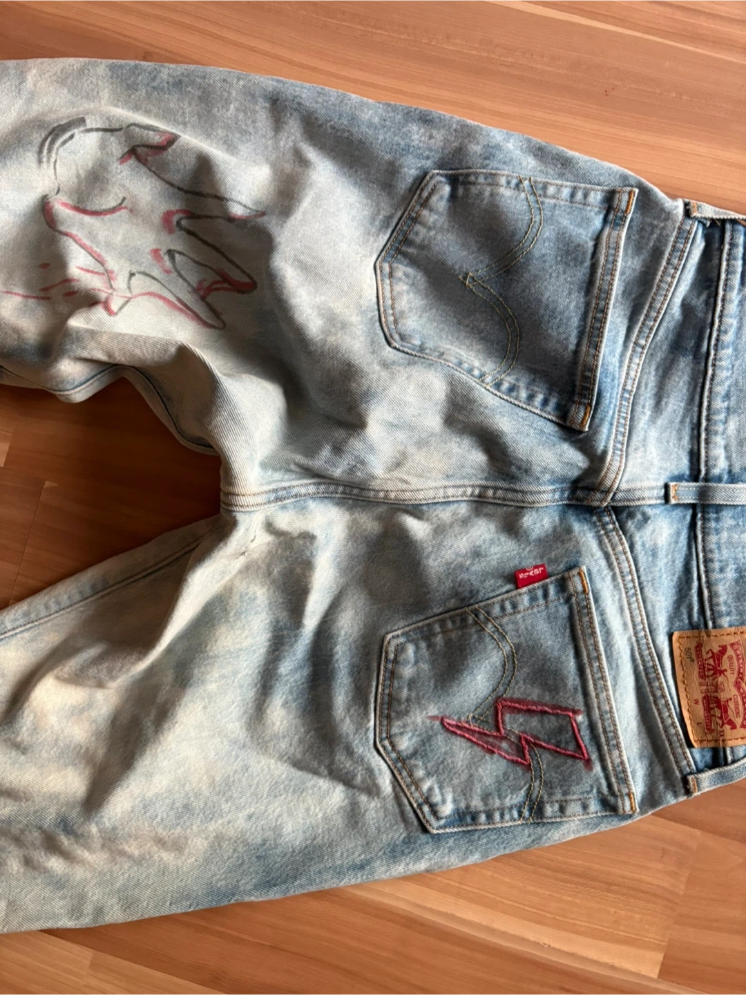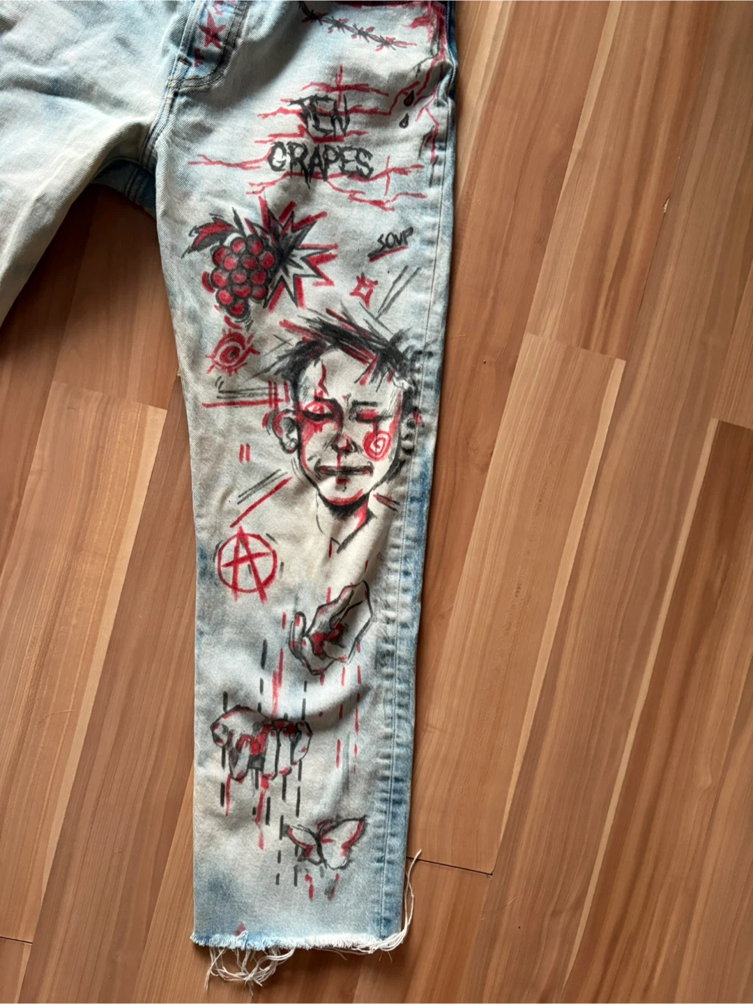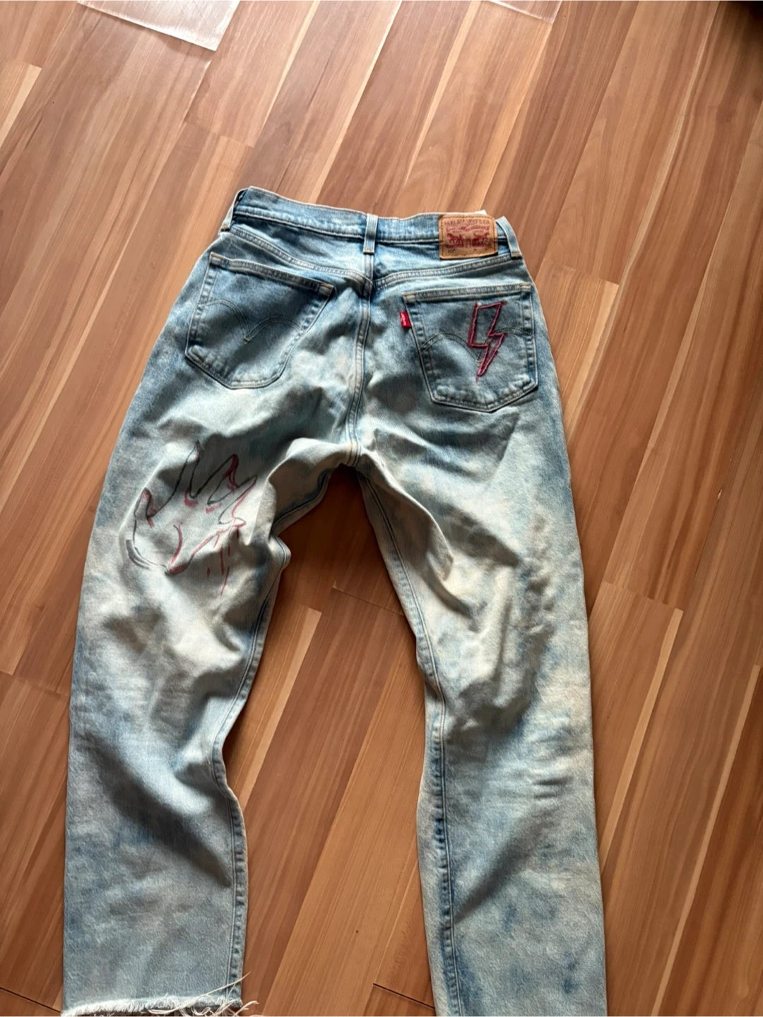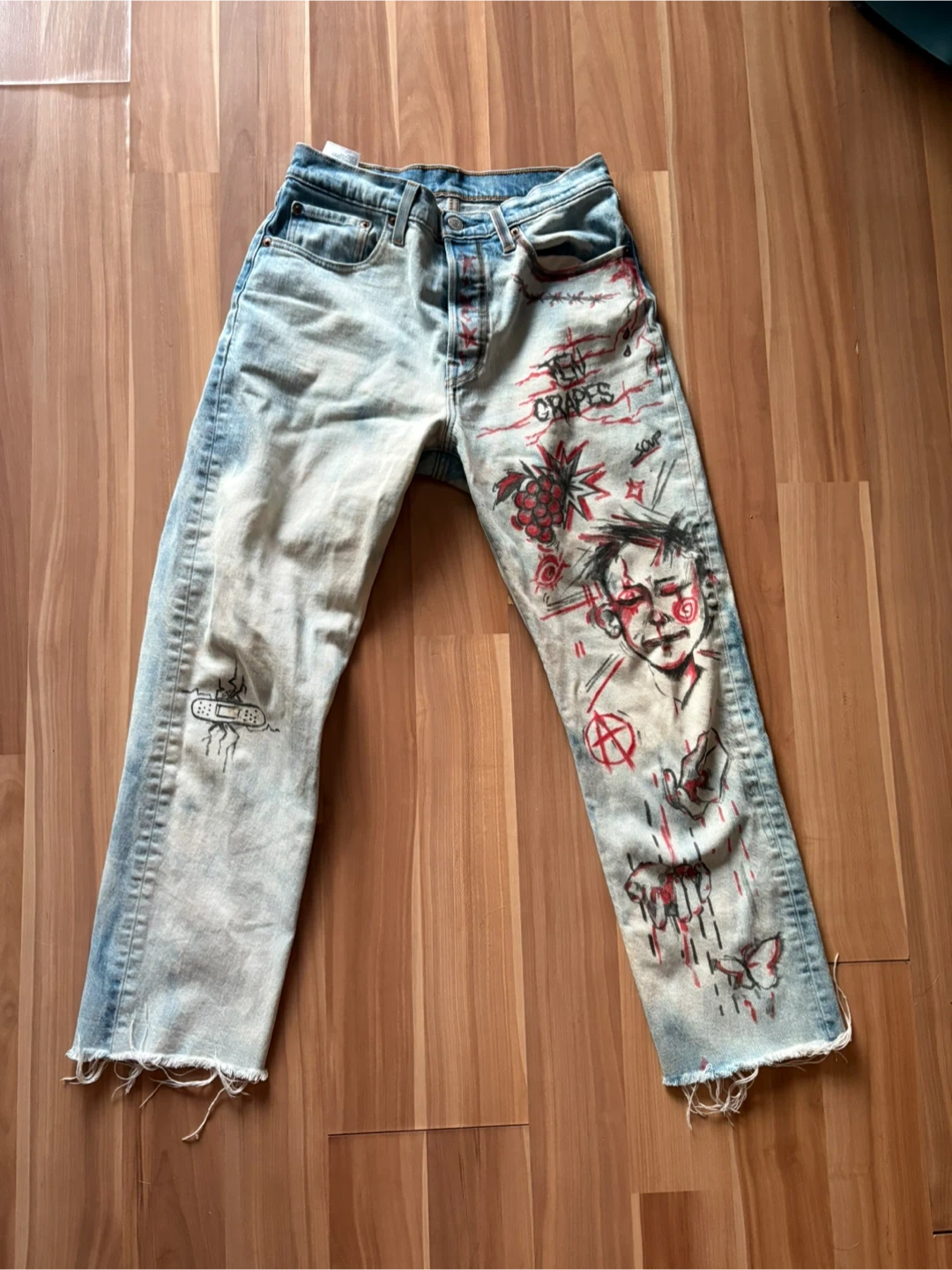 No size tag but fits like a 28 little bit of stretch commissioned by artist just doesn’t not fit anymore