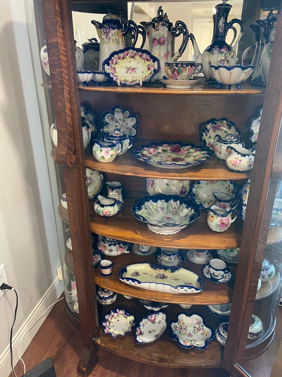 16Beautiful collection of unmarked Nippon cobalt blue China dishes. Made in Japan. 58 pieces total. Make me an offer for the whole set. Or I will sell pieces individually for anywhere from $5-$25 depending on the piece. More photos available upon request. One small dish has a broken handle, but no other damage on everything else.
