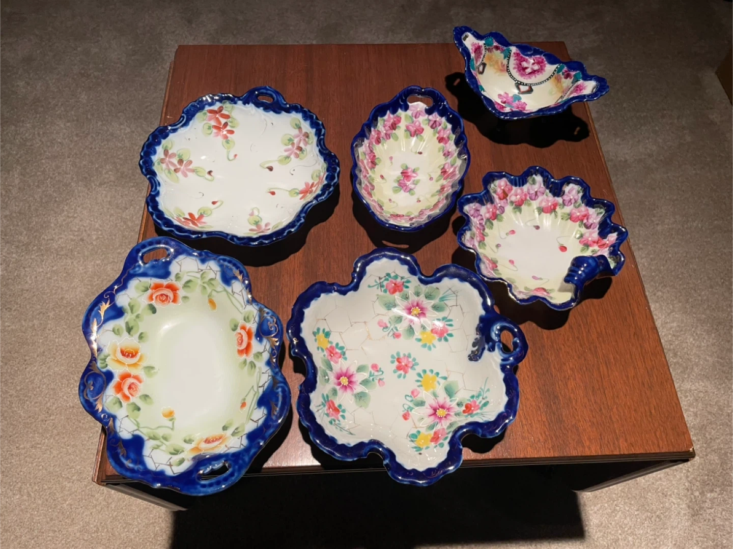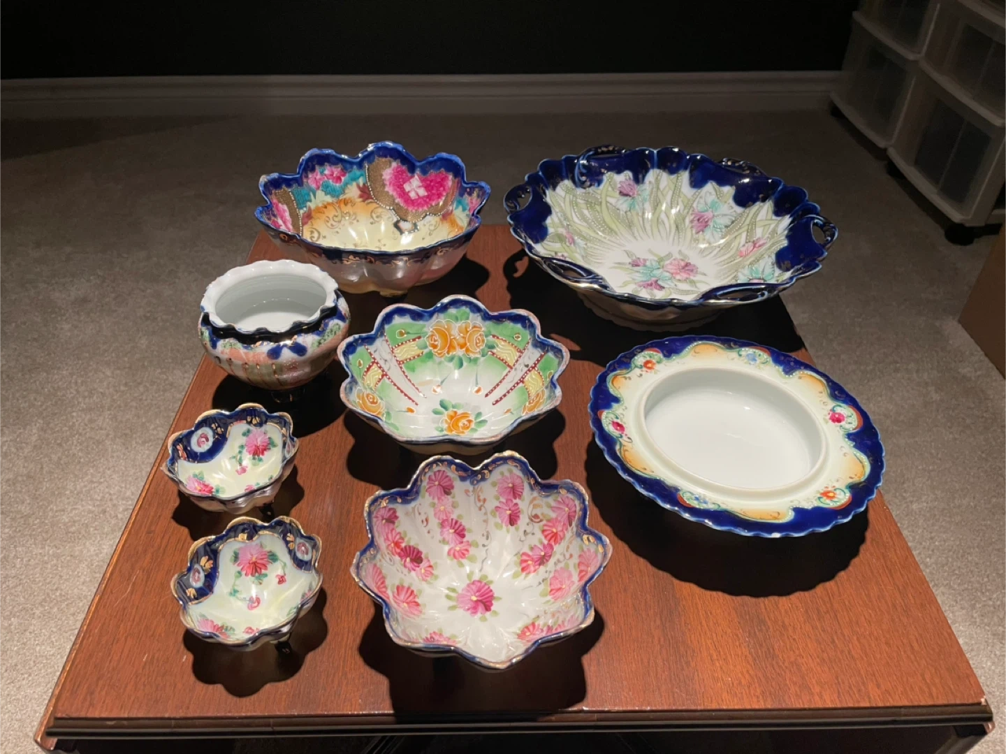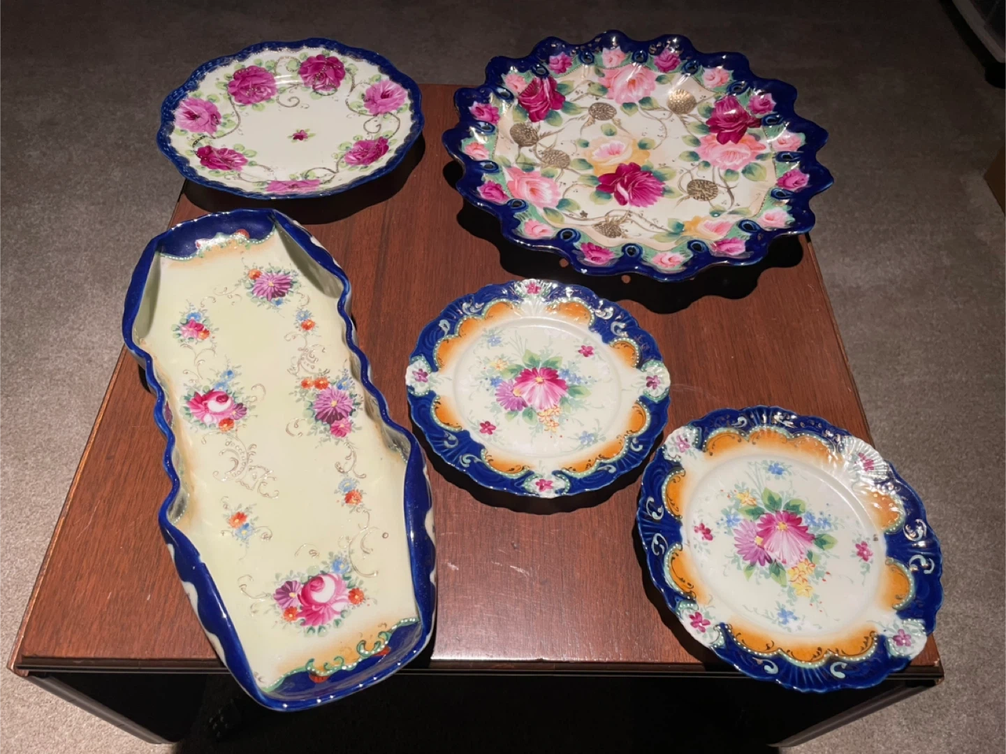 10Beautiful collection of unmarked Nippon cobalt blue China dishes. Made in Japan. 58 pieces total. Make me an offer for the whole set. Or I will sell pieces individually for anywhere from $5-$30 depending on the piece. More photos available upon request. One small dish has a broken handle, but no other damage on everything else.