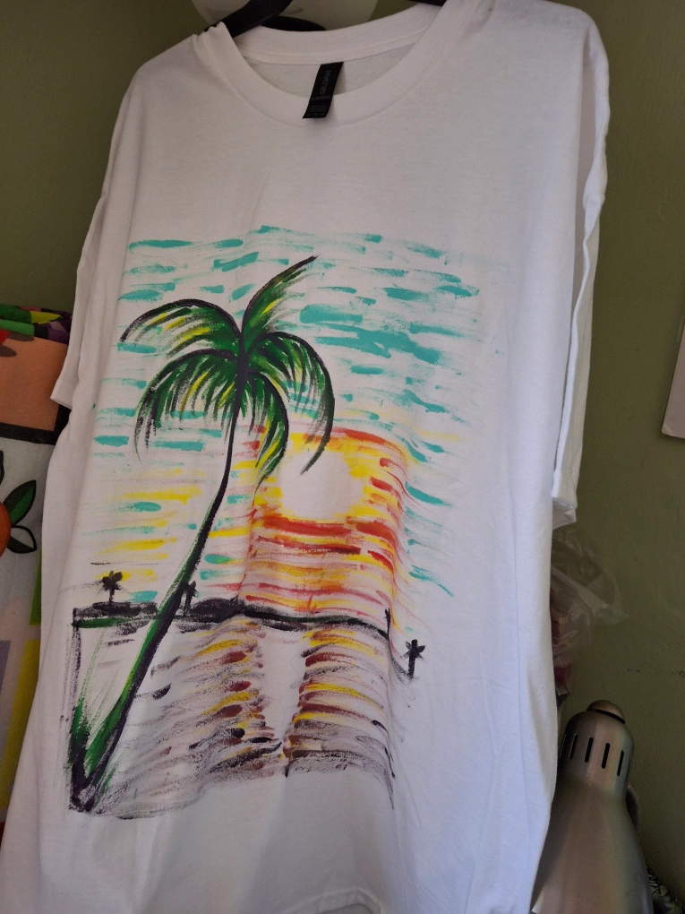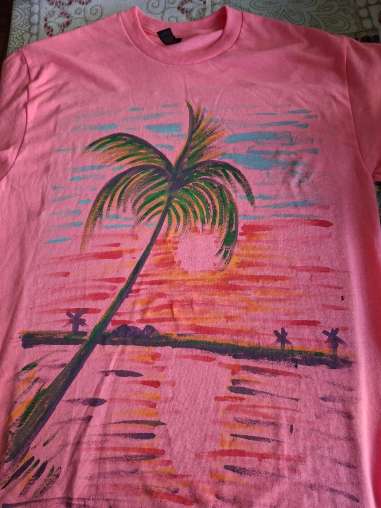 Selling these unique, hand-painted palm tree t-shirts! Each one is a one-of-a-kind piece of wearable art. Available in pink and white. Perfect for adding a tropical vibe to your wardrobe!