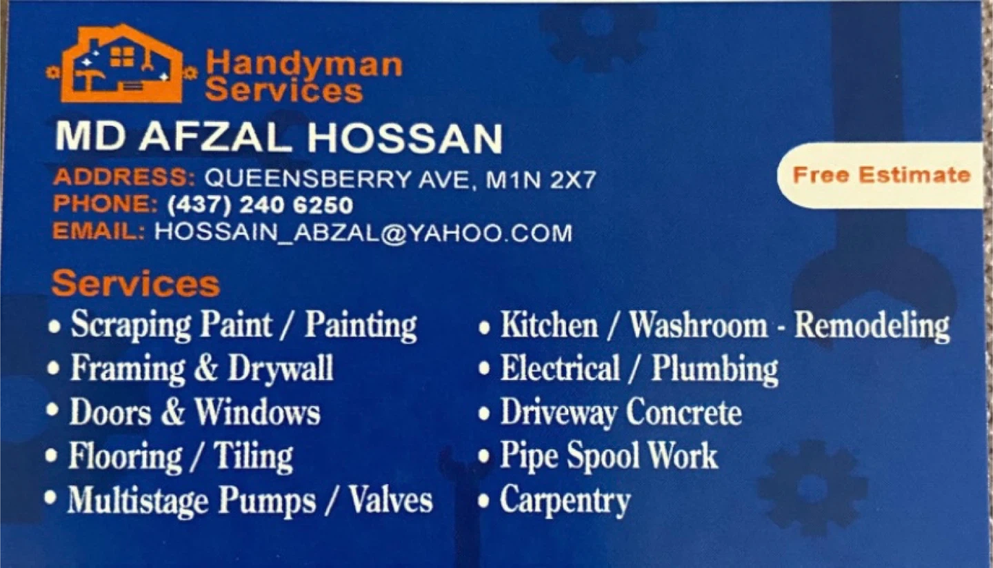 Need repairs or upgrades around your home? No job is too small! I offer reliable and affordable handyman services โ from fixing doors, painting, and flooring to assembling furniture and small renovations. โ Fast & professional service โ Fair pricing โ Free estimates ๐ Call/Text: 4372406250