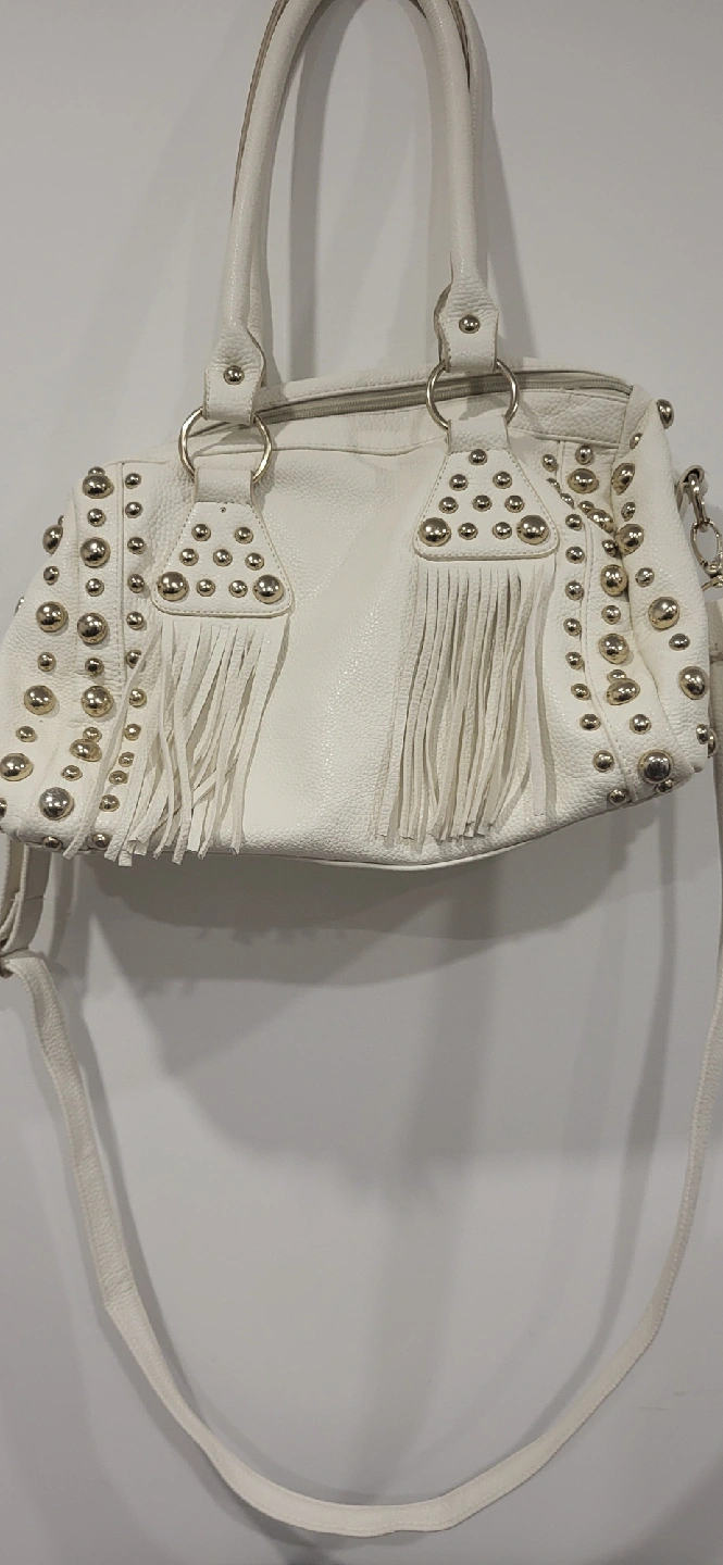 White handbag, with gold studs and tassles. It has a long shoulder strap and two straps for either hands or shoulders.