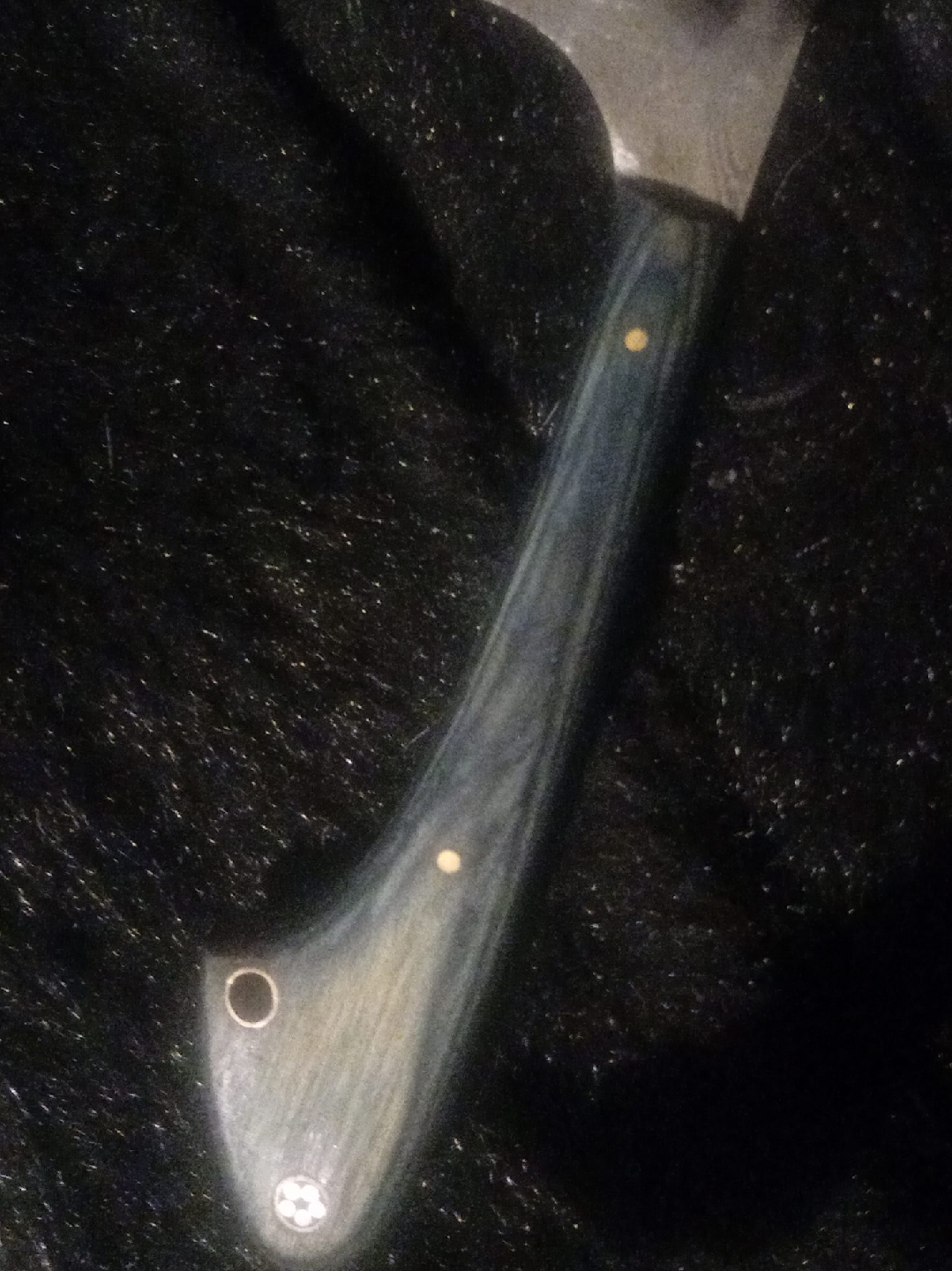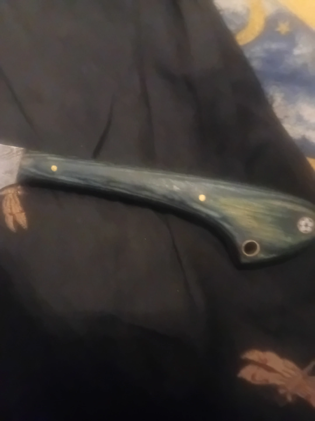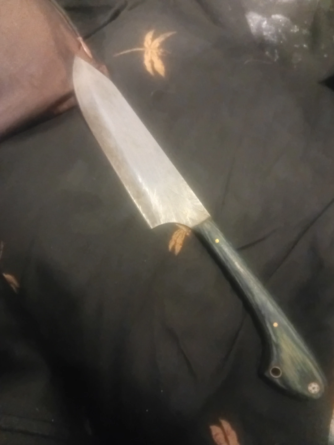 10Selling a unique, handcrafted kitchen knife. It has a beautiful, patterned blade and a comfortable, ergonomic handle. The handle is a lovely blue-green colour with subtle wood grain detailing. It's in great condition and ready for a new home!