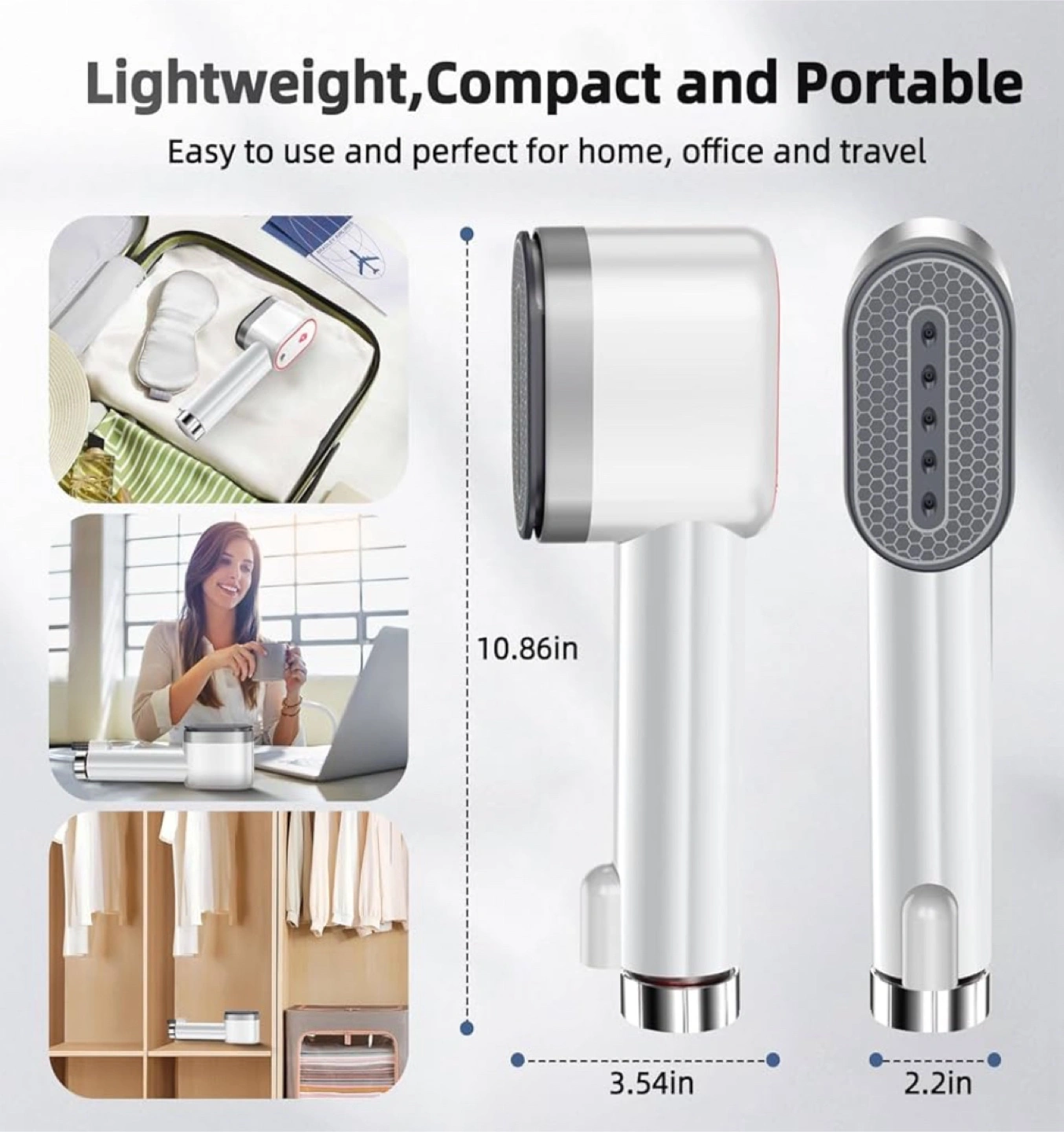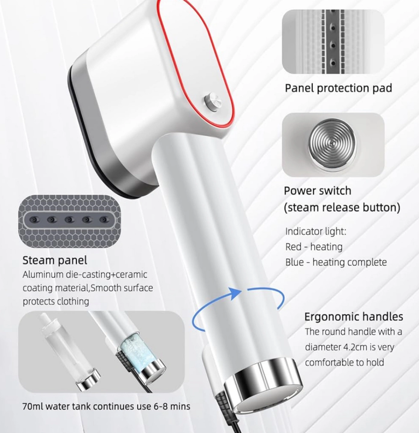 Get rid of wrinkles quickly with this handheld clothes steamer! It's suitable for various fabrics like chiffon, cotton, silk, linen, wool, and nylon. The steamer features a steam panel with aluminum die-casting and ceramic coating material for a smooth surface that protects clothing. It also has ergonomic handles, a 70ml water tank that continues use for 6-8 minutes, and heats up in just 15 seconds. Lightweight and portable, it's perfect for travel or quick touch-ups Handheld Steamer for Clothes, Travel Steamer, Horizontal & Vertical Steaming, Fast Heat Up, Wrinkles Remover with Storage Bag, Portable 800W Fabric Steamer, Perfect for Home, Office and Travel, 120V