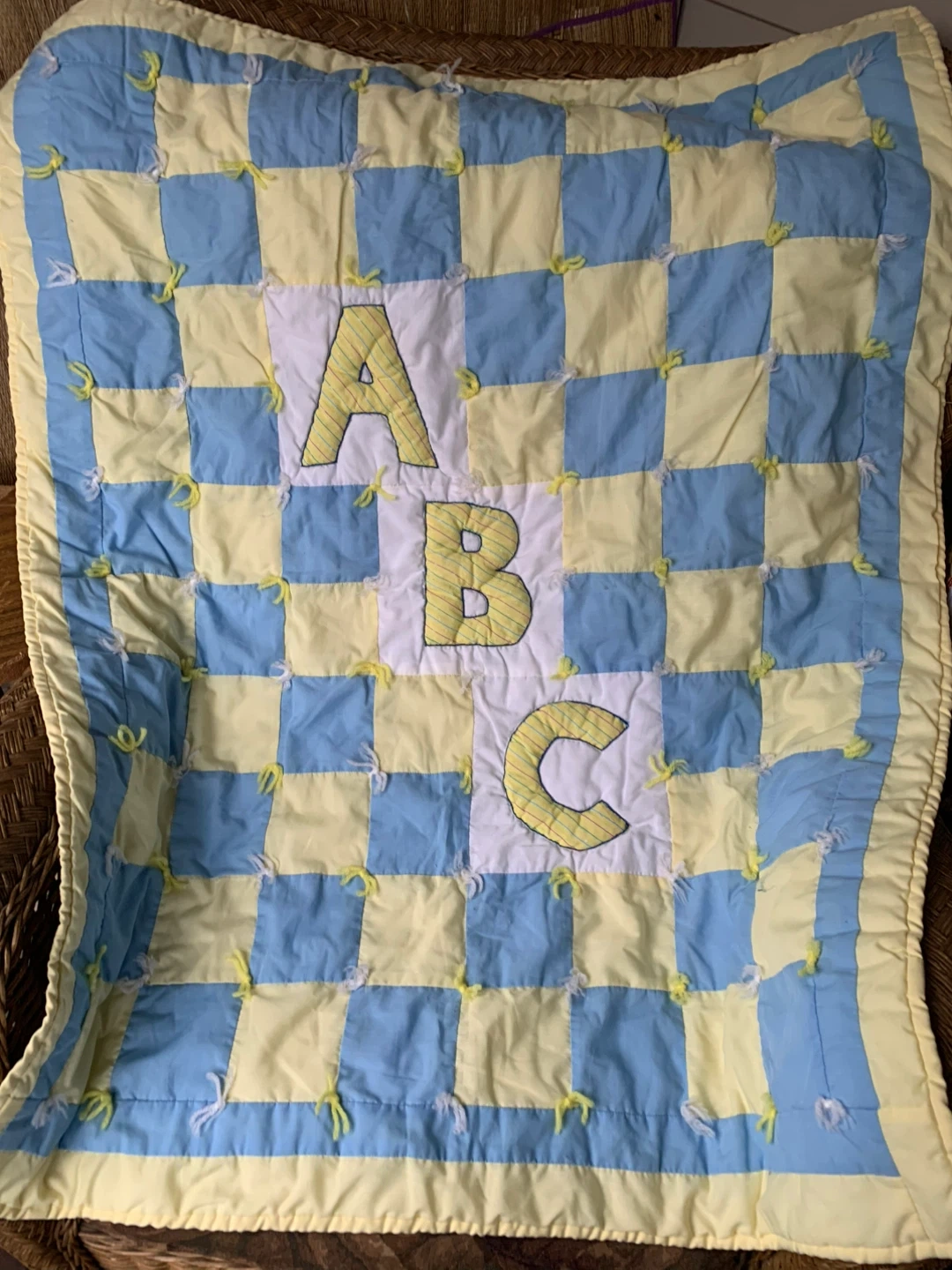 5This is a cute baby quilt with an ABC design. Size 110m x 87m.It features a patchwork of blue and yellow squares, with the letters A, B, and C appliqued in the center. The other side has a bunny print. Hand tied squares. It’s in great condition and perfect for a baby's nursery! From Grandma’s estate collection