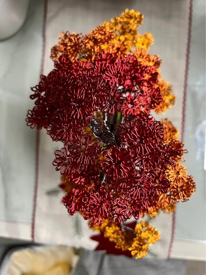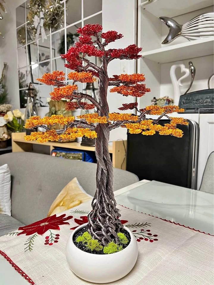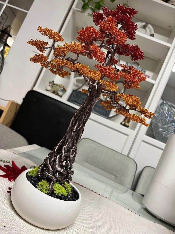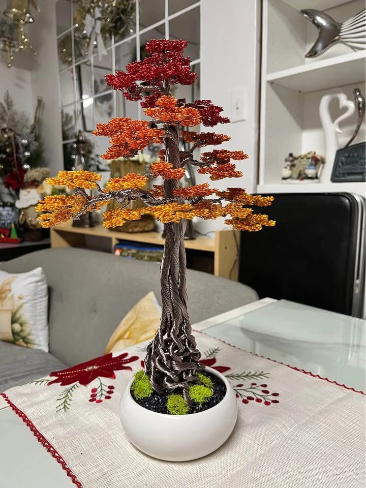 76Celebrate the beauty of fall with this handcrafted aluminum wire bonsai tree, inspired by the golden hues and cozy spirit of autumn. Each tree is carefully shaped by hand, featuring warm tones of copper, bronze, and gold wire that capture the essence of changing leaves. CASH ONLY 💰 ✨ Details: • Handmade using premium aluminum wire • Autumn color palette: copper, gold, bronze, and amber tones • Mounted on a ceramic white pot • Approx. 17 inches tall, 10 inches wide (each piece is unique) • Perfect for home, office, or as a seasonal gift • No watering or maintenance required 🍂 Why You’ll Love It: This autumn bonsai brings a warm, rustic charm to any space. Its metallic leaves shimmer beautifully under natural light, creating a peaceful and artistic vibe. A perfect centerpiece for your home this fall — or a heartfelt handmade gift that symbolizes change, strength, and harmony.