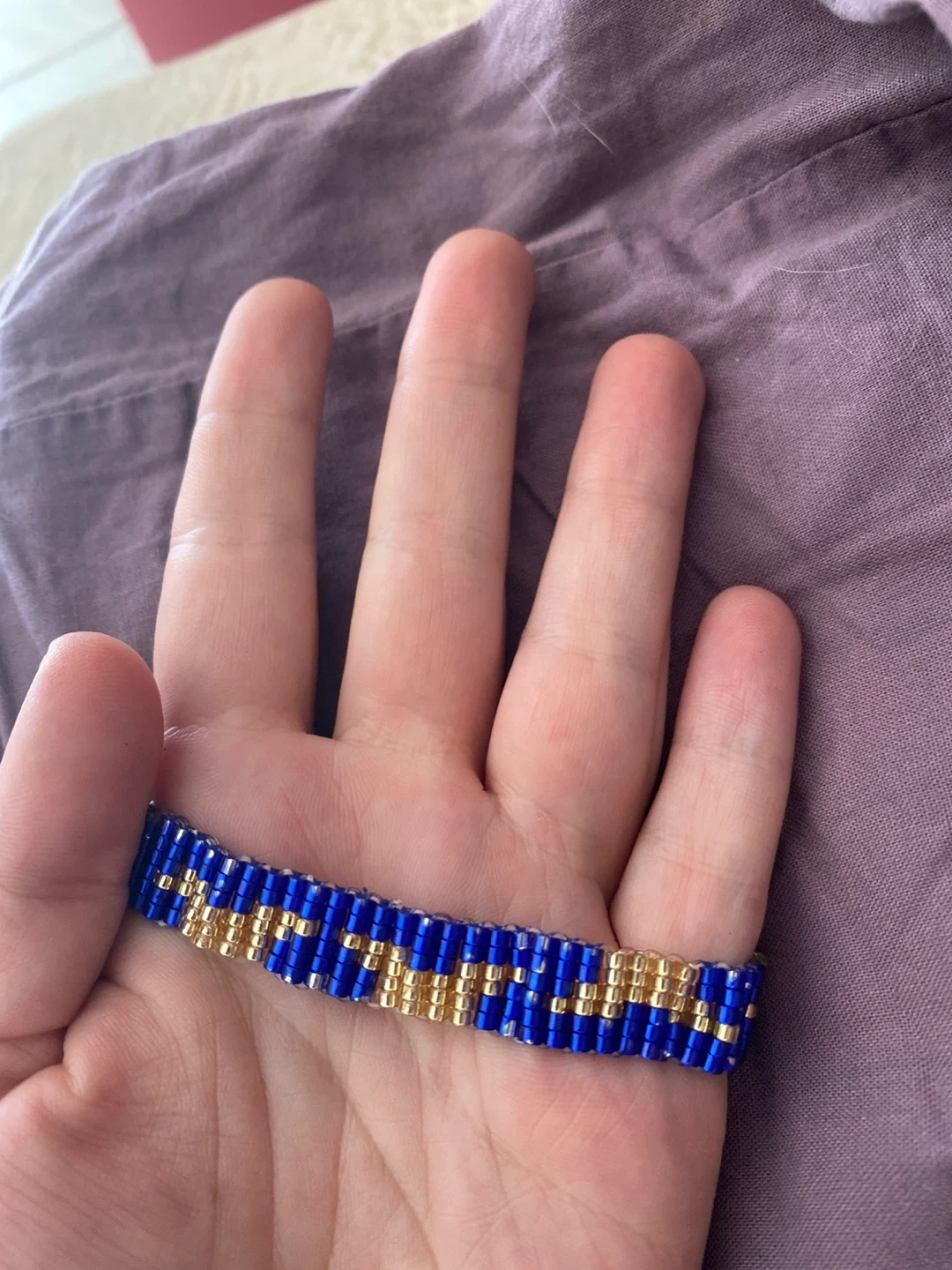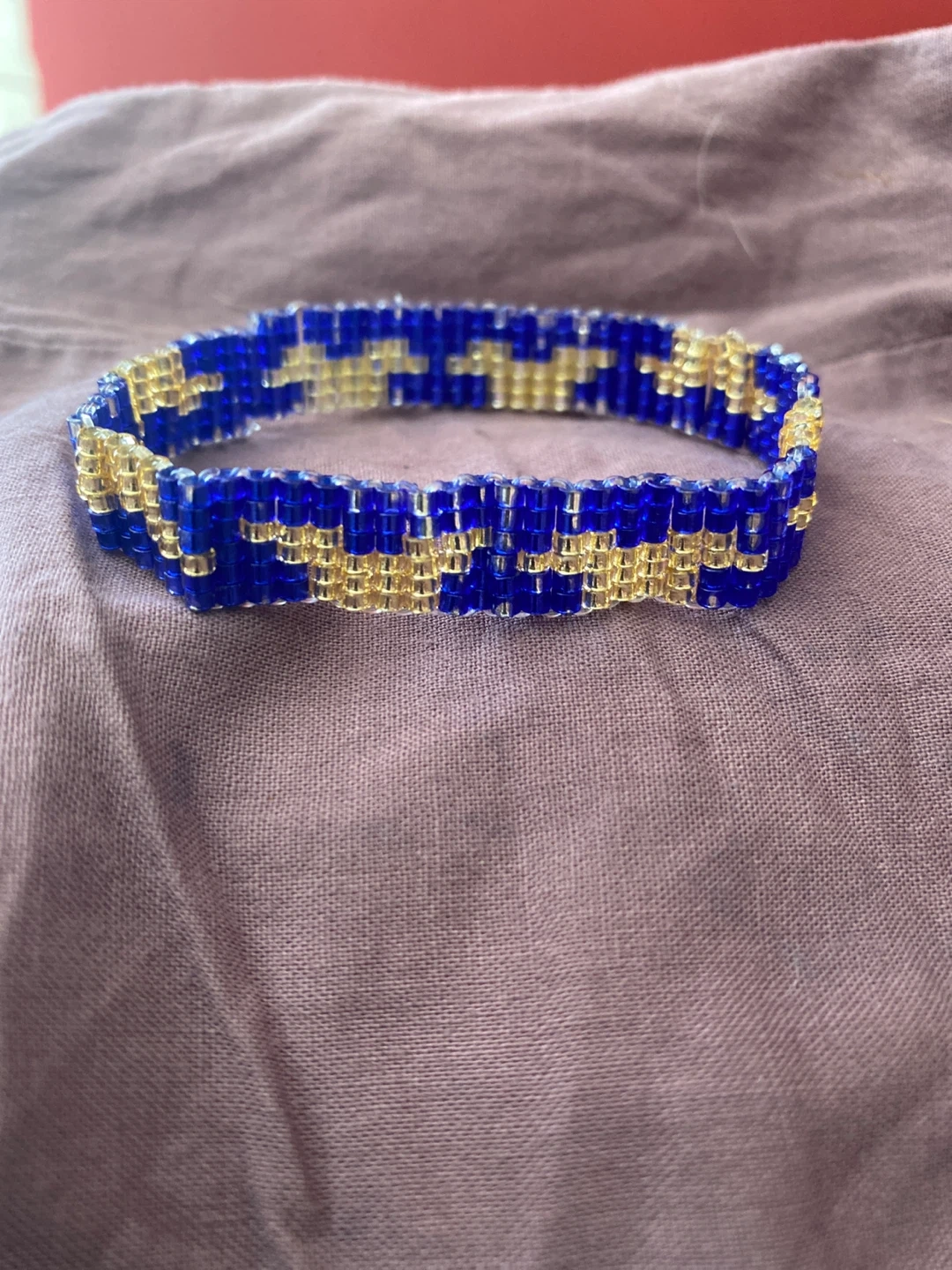 This is a handmade beaded bracelet. It features a dog ear pattern of blue and gold beads. It would be a cute addition to any outfit!
