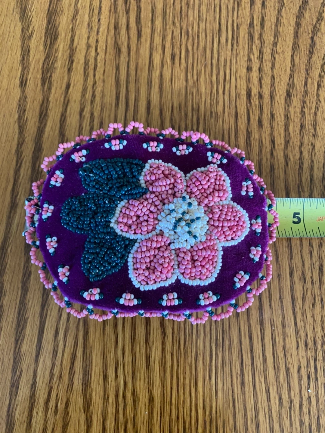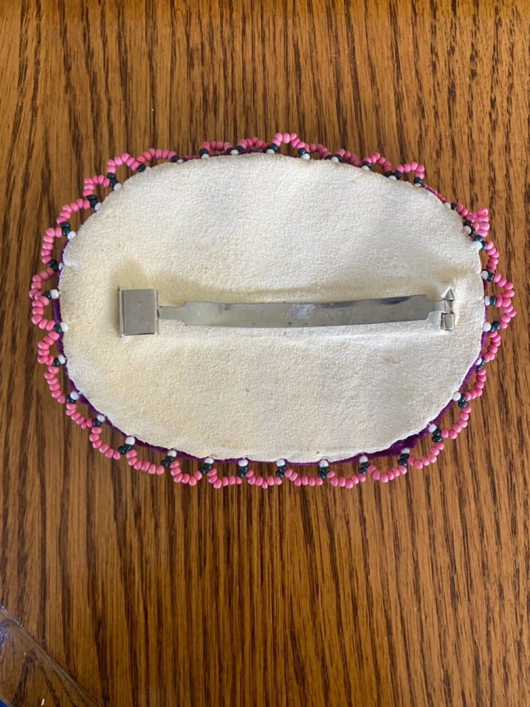 This is a handmade beaded hair clip with a beautiful floral design. It features intricate beadwork in pink, white, and green on a purple background. The clip is in great condition and ready to add a touch of unique style to your hair