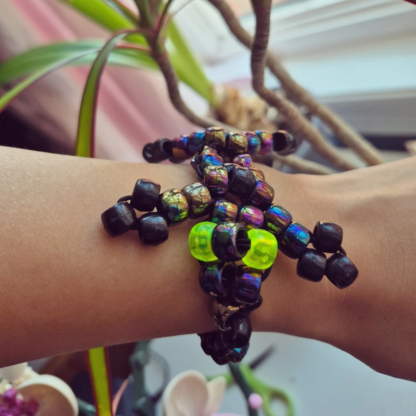 51Check out this unique handmade beaded keychain & bracelet! It's a fun and colourful accessory to add to your keys or backpack. The beads are arranged in a cool design, and it comes in its packaging. A great way to show off your style!