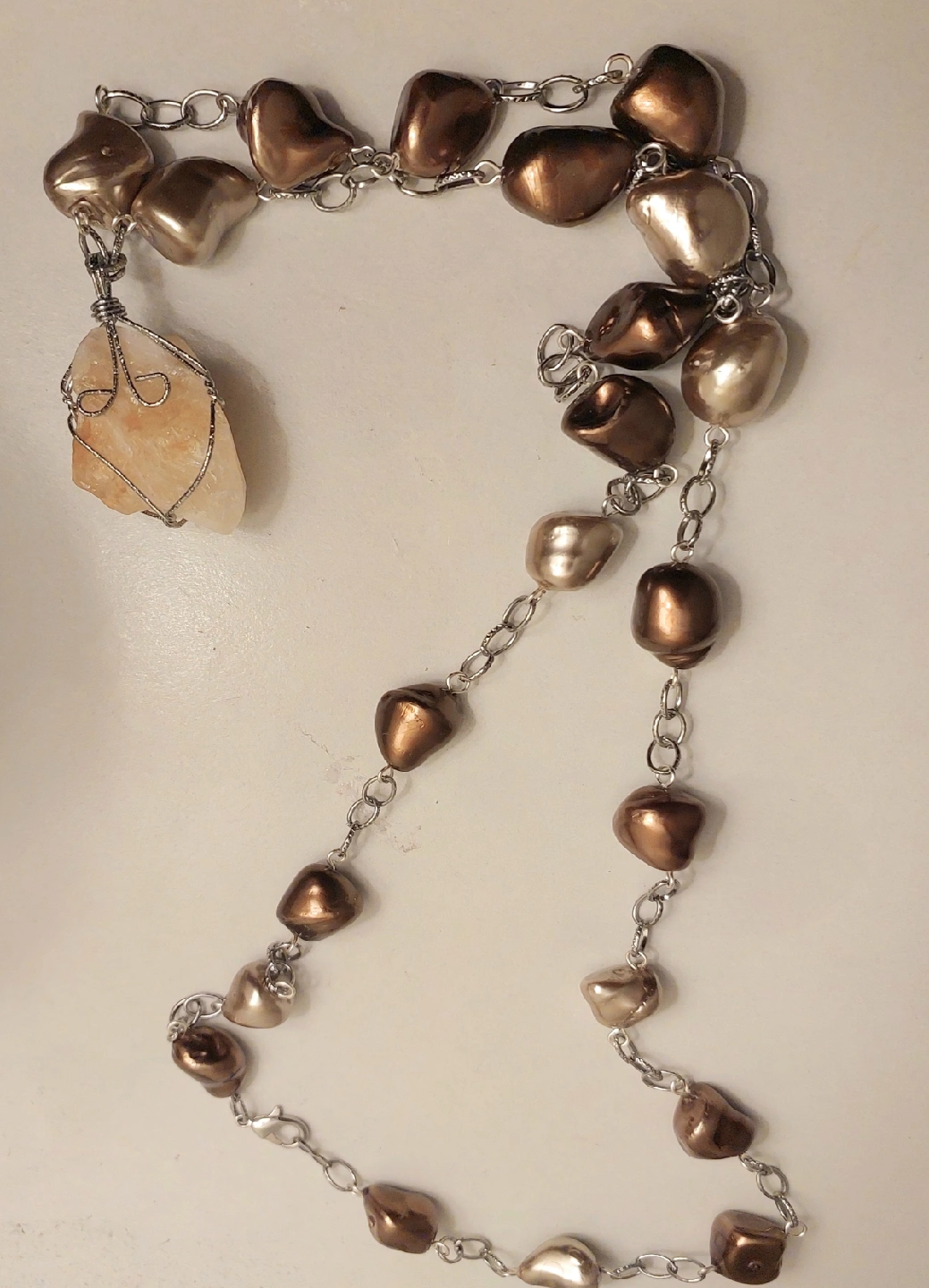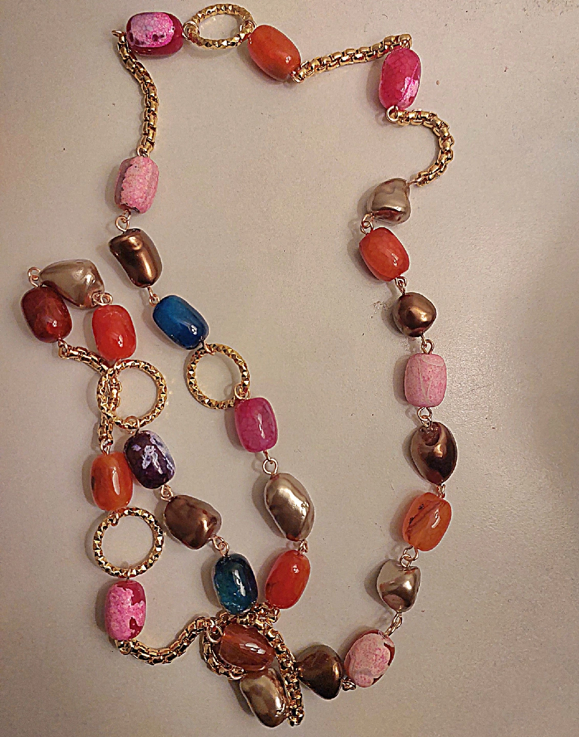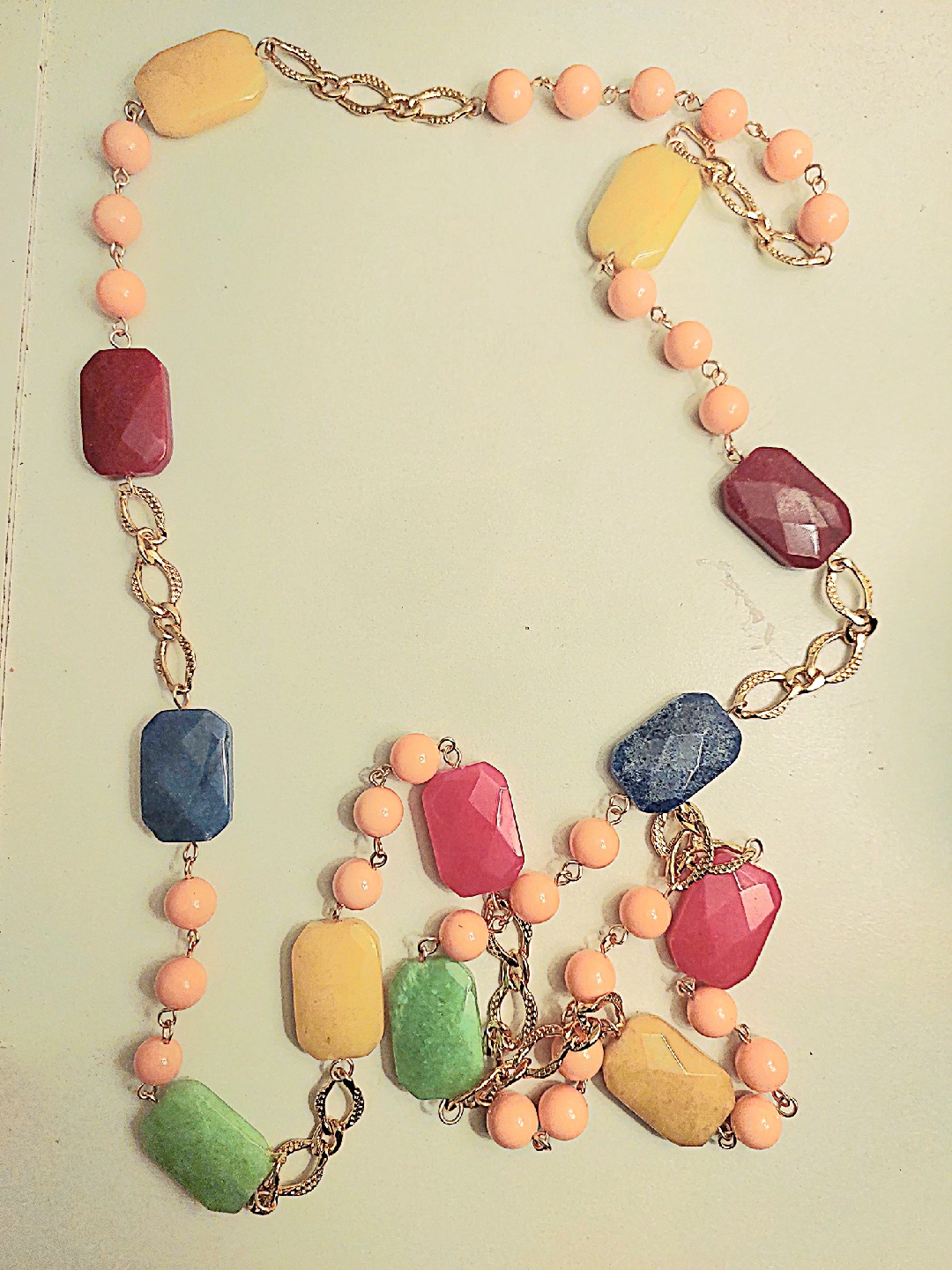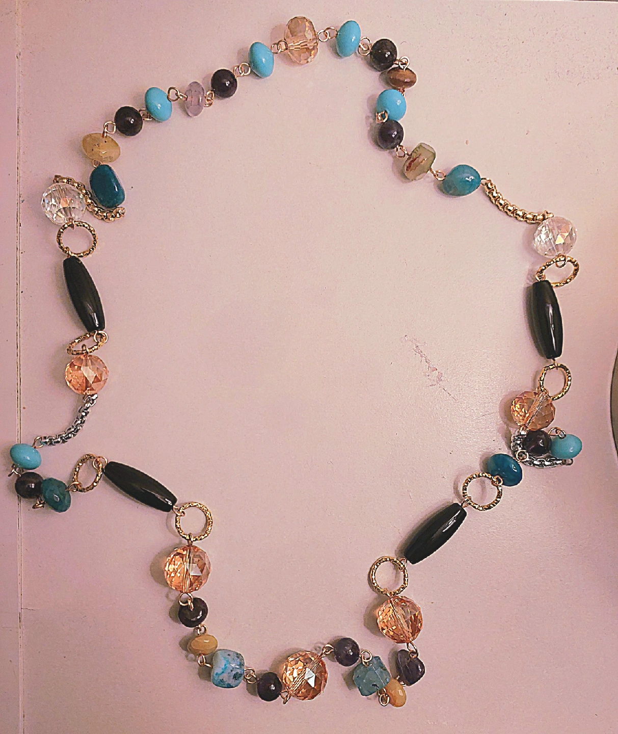 Selling a unique handmade beaded necklace. It features a mix of different beads and colours, making it a one-of-a-kind piece! Perfect to add a pop of style to any outfit