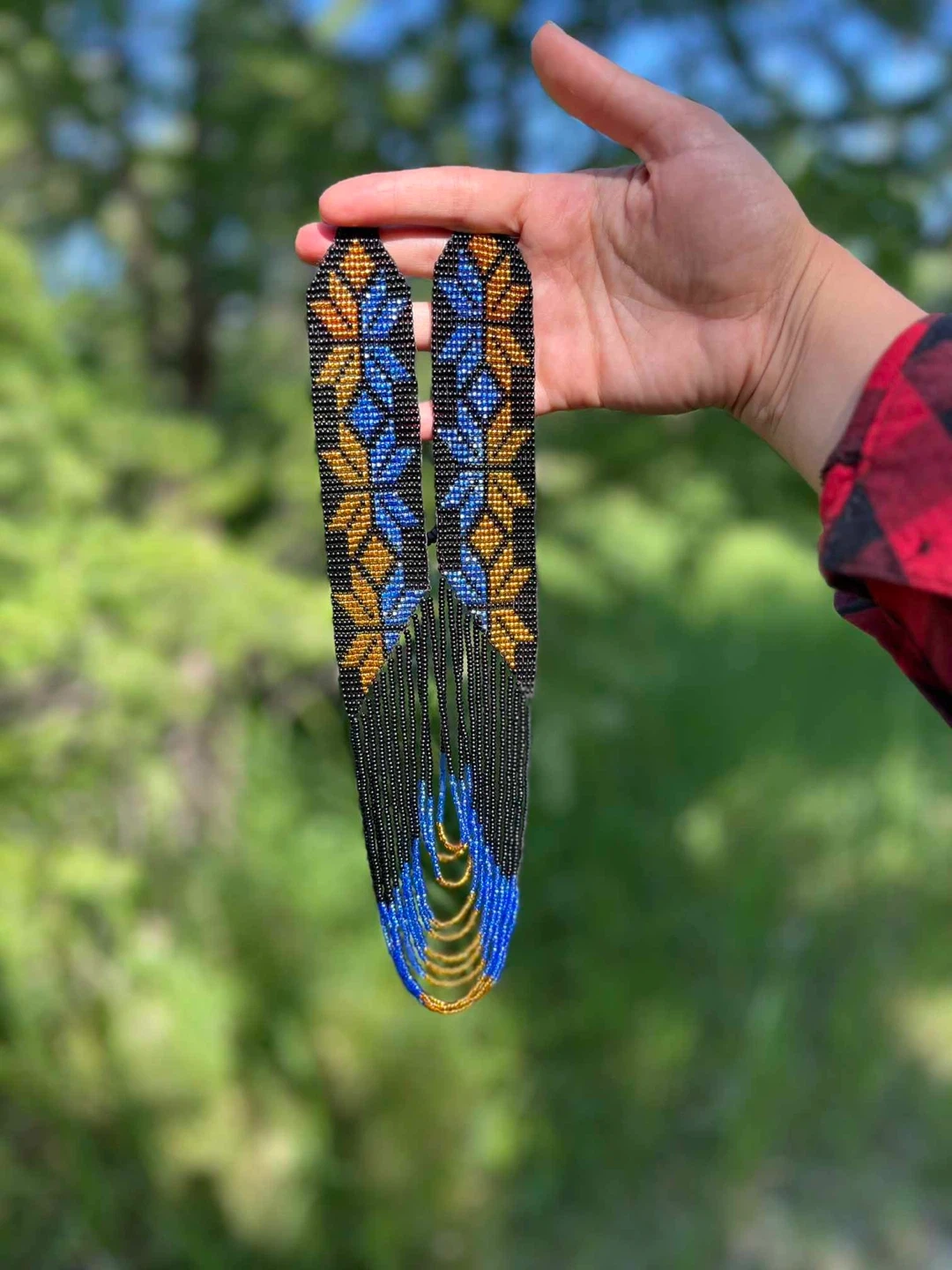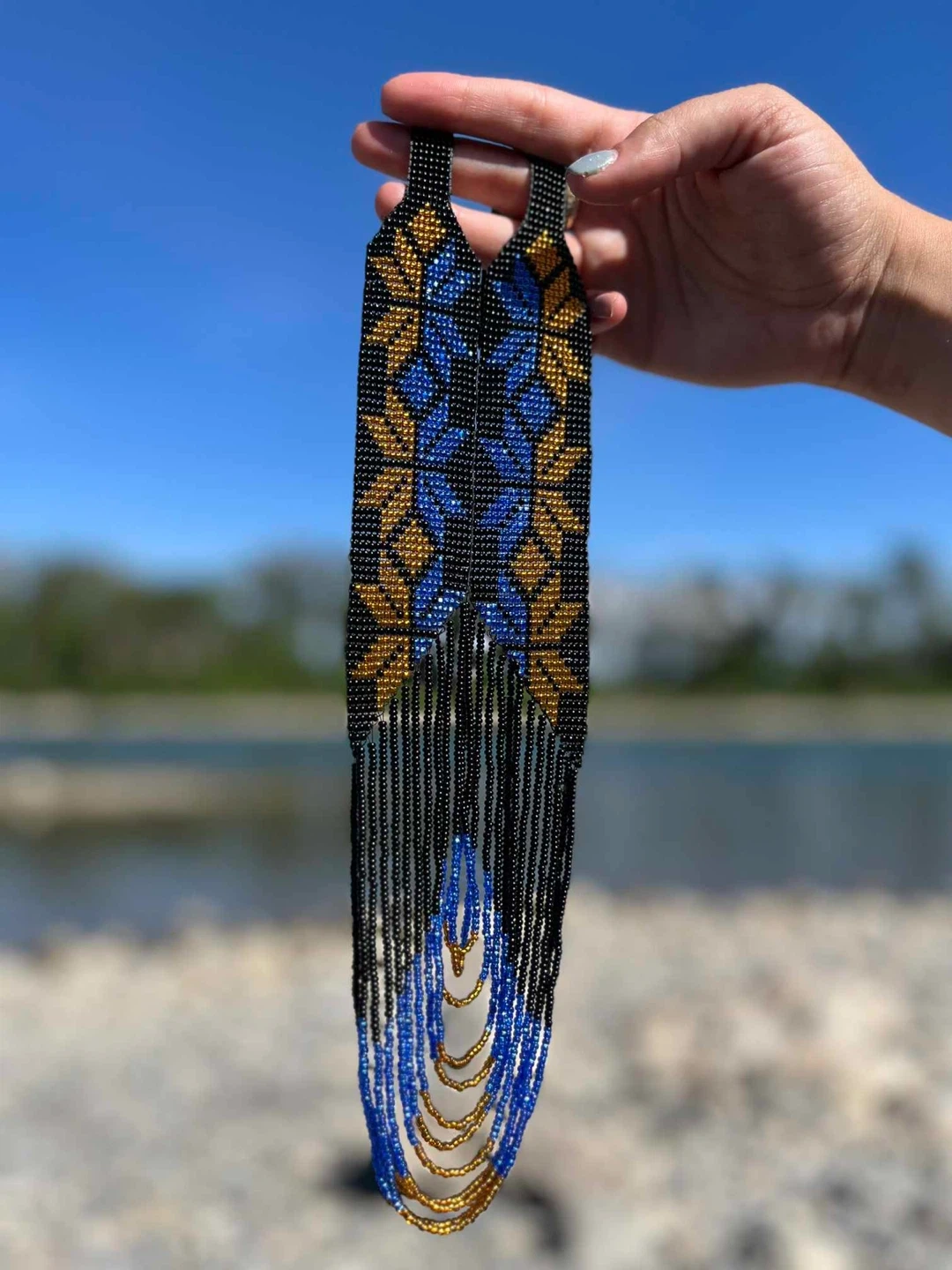 31Beautiful handmade beaded necklace featuring a lovely blue and gold floral design on a black background. Adds a unique touch to any outfit!
