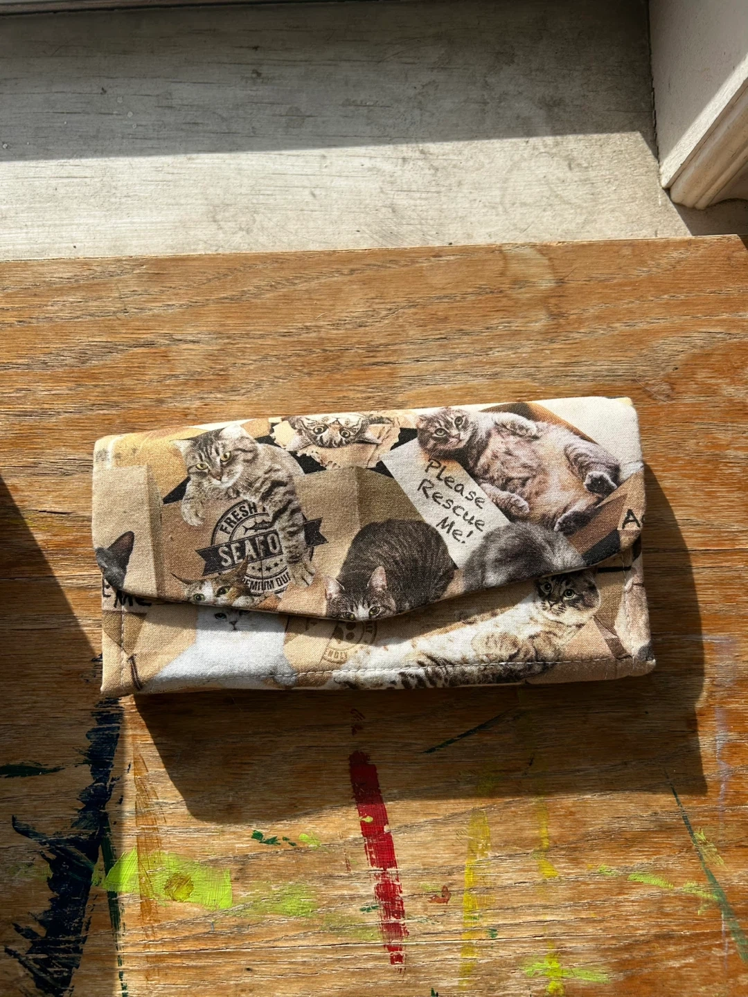 489Check out this adorable handmade wallet featuring a fun cat print! It has a snap closure and plenty of space for your cards and cash. The wallet is in great condition and ready for a new home