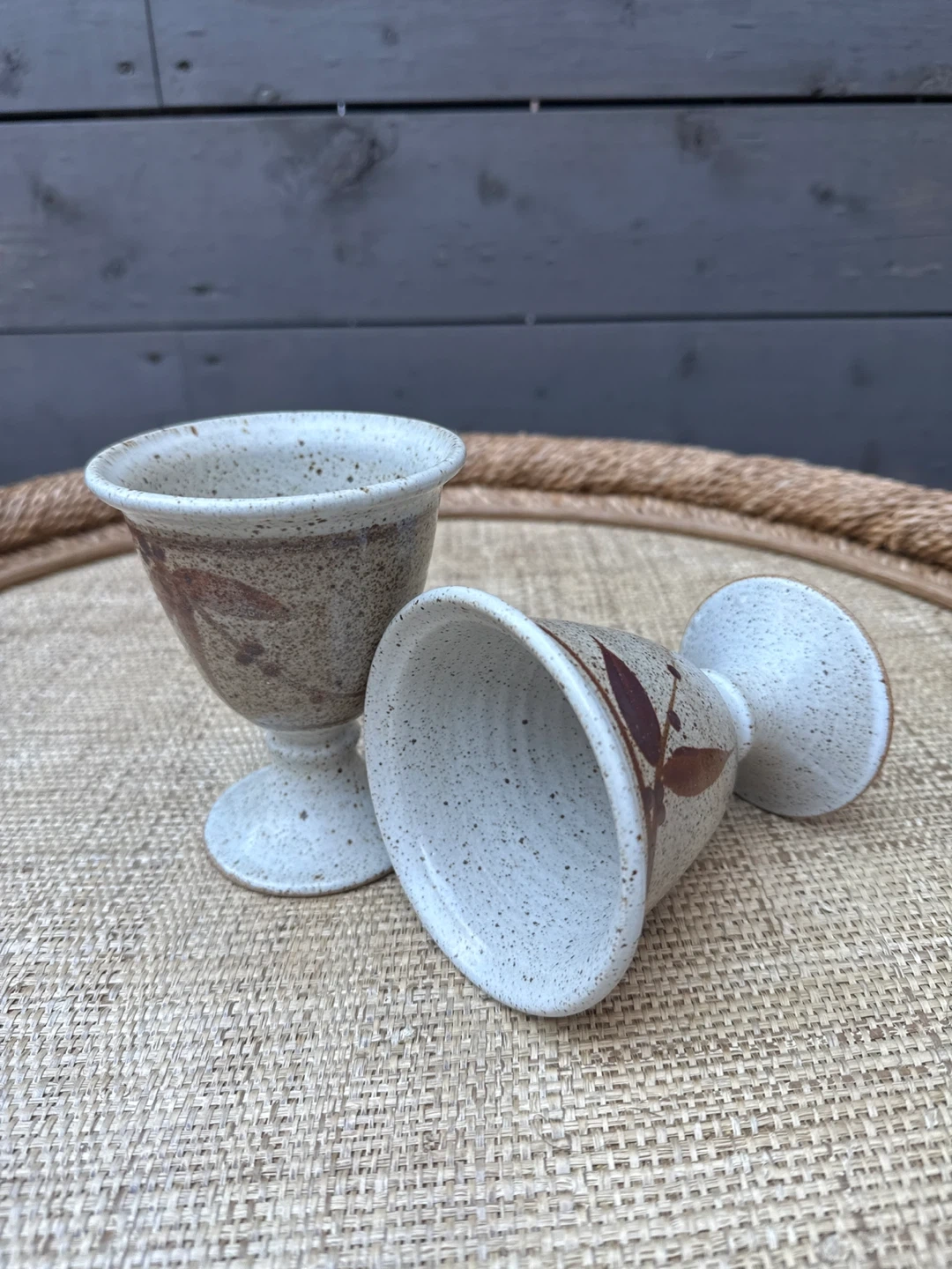 Collectors of Canadian Handmade Pottery. Set of 2 handmade ceramic cups! These are in great condition and would look lovely on any breakfast table. They have a speckled, earthy look and feel, featuring a unique leaf design.